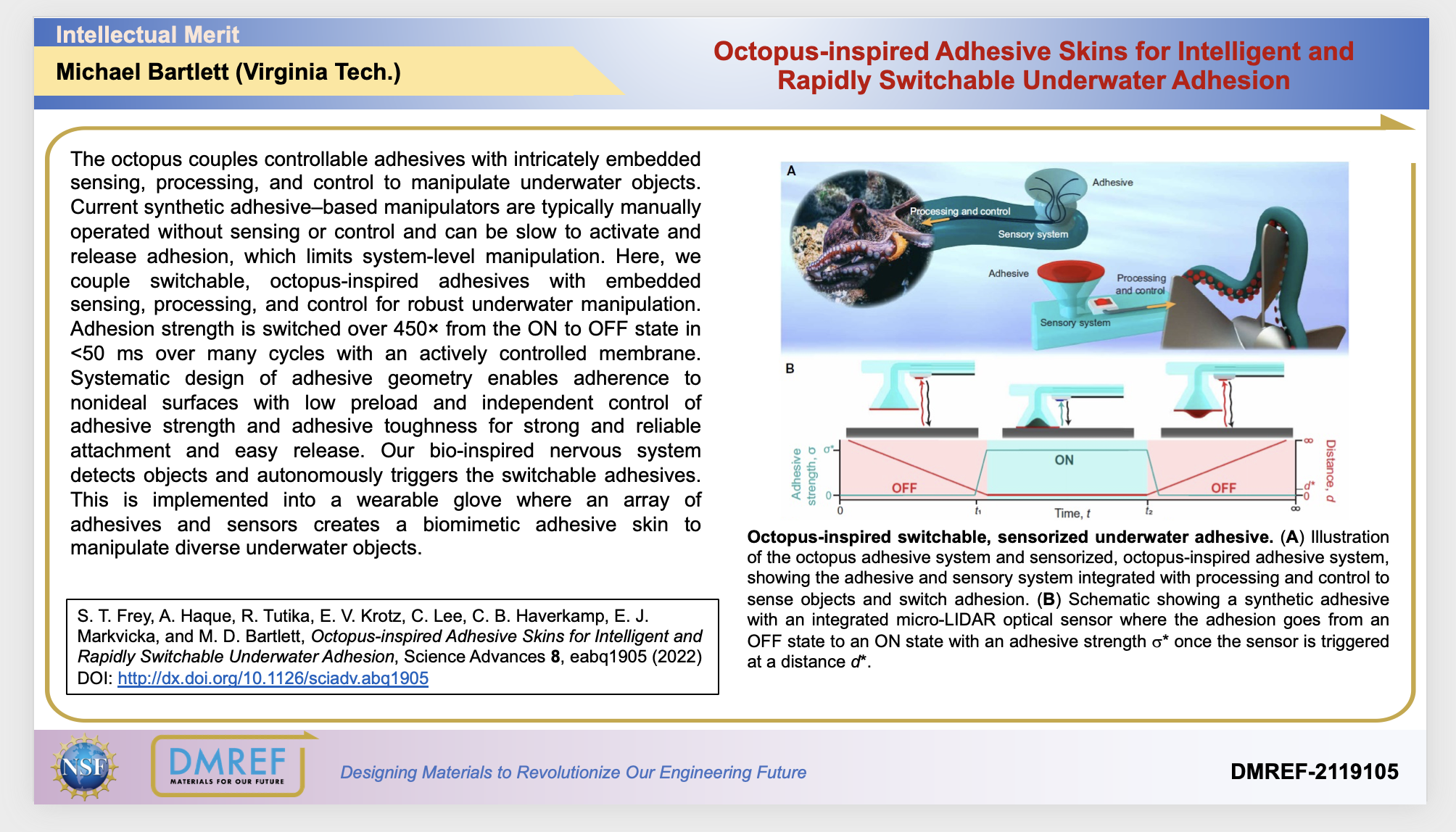 The octopus couples controllable adhesives with intricately embedded sensing, processing, and control to manipulate underwater objects. Current synthetic adhesive–based manipulators are typically manually operated without sensing or control and can be slow to activate and release adhesion, which limits system-level manipulation. Here, we couple switchable, octopus-inspired adhesives with embedded sensing, processing, and control for robust underwater manipulation. Adhesion strength is switched over 450× from the ON to OFF state in <50 ms over many cycles with an actively controlled membrane. Systematic design of adhesive geometry enables adherence to nonideal surfaces with low preload and independent control of adhesive strength and adhesive toughness for strong and reliable attachment and easy release. Our bio-inspired nervous system detects objects and autonomously triggers the switchable adhesives. This is implemented into a wearable glove where an array of adhesives and sensors creates a biomimetic adhesive skin to manipulate diverse underwater objects.