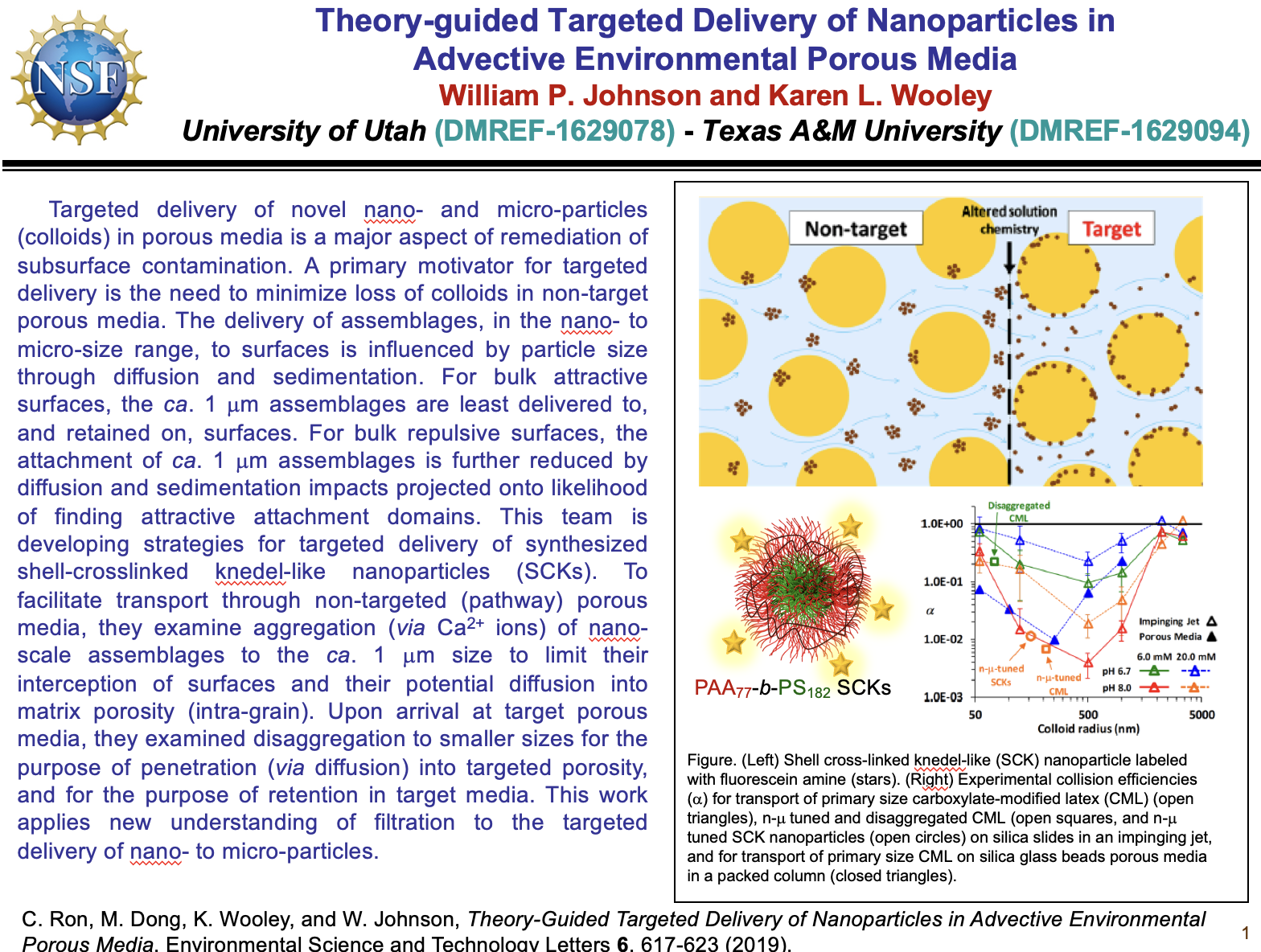 Targeted delivery of novel nano- and micro-particles (colloids) in porous media is a major aspect of remediation of subsurface contamination. A primary motivator for targeted delivery is the need to minimize loss of colloids in non-target porous media. The delivery of assemblages, in the nano- to micro-size range, to surfaces is influenced by particle size through diffusion and sedimentation. For bulk attractive surfaces, the ca. 1 mm assemblages are least delivered to, and retained on, surfaces. For bulk repulsive surfaces, the attachment of ca. 1 mm assemblages is further reduced by diffusion and sedimentation impacts projected onto likelihood of finding attractive attachment domains. This team is developing strategies for targeted delivery of synthesized shell-crosslinked knedel-like nanoparticles (SCKs). To facilitate transport through non-targeted (pathway) porous media, they examine aggregation (via Ca2+ ions) of nano-scale assemblages to the ca. 1 mm size to limit their interception of surfaces and their potential diffusion into matrix porosity (intra-grain). Upon arrival at target porous media, they examined disaggregation to smaller sizes for the purpose of penetration (via diffusion) into targeted porosity, and for the purpose of retention in target media. This work appliesnew understanding of filtration to the targeted delivery of nano- to micro-particles.