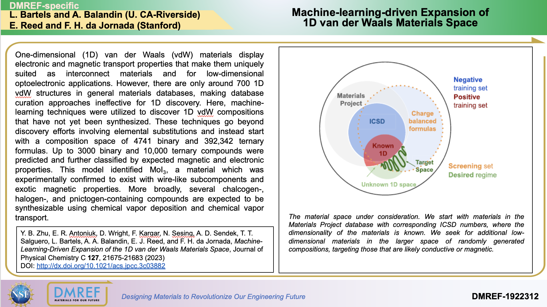 One-dimensional (1D) van der Waals (vdW) materials display electronic and magnetic transport properties that make them uniquely suited as interconnect materials and for low-dimensional optoelectronic applications. However, there are only around 700 1D vdWstructures in general materials databases, making database curation approaches ineffective for 1D discovery. Here, machine-learning techniques were utilized to discover 1D vdWcompositions that have not yet been synthesized.