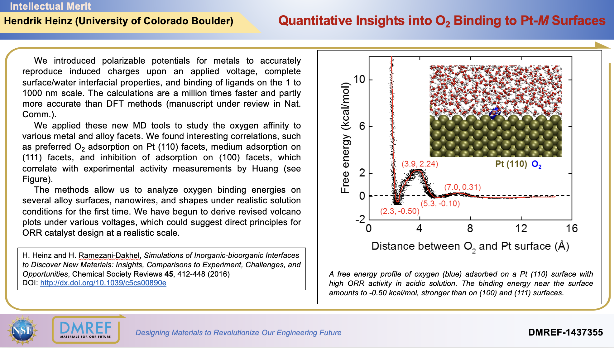 We applied these new MD tools to study the oxygen affinity to various metal and alloy facets. We found interesting correlations, such as preferred O2 adsorption on Pt (110) facets, medium adsorption on (111) facets, and inhibition of adsorption on (100) facets, which correlate with experimental activity measurements by Huang (see Figure).