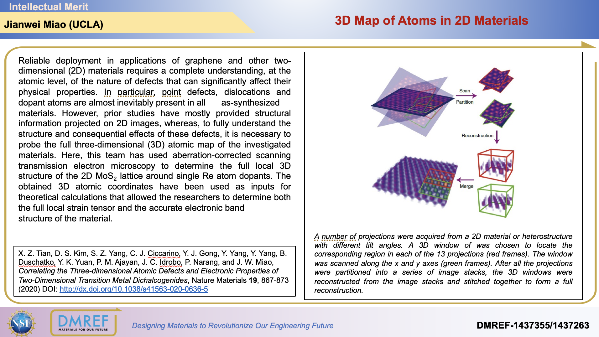 Reliable deployment in applications of graphene and other two-dimensional (2D) materials requires a complete understanding, at the atomic level, of the nature of defects that can significantly affect their physical properties. In particular, point defects, dislocations and dopant atoms are almost inevitably present in all as-synthesized materials. However, prior studies have mostly provided structural information projected on 2D images, whereas, to fully understand the structure and consequential effects of these defects, it is necessary to probe the full three-dimensional (3D) atomic map of the investigated materials. Here, this team has used aberration-corrected scanning transmission electron microscopy to determine the full local 3D structure of the 2D MoS2 lattice around single Re atom dopants. The obtained 3D atomic coordinates have been used as inputs for theoretical calculations that allowed the researchers to determine both the full local strain tensor and the accurate electronic band structure of the material.
