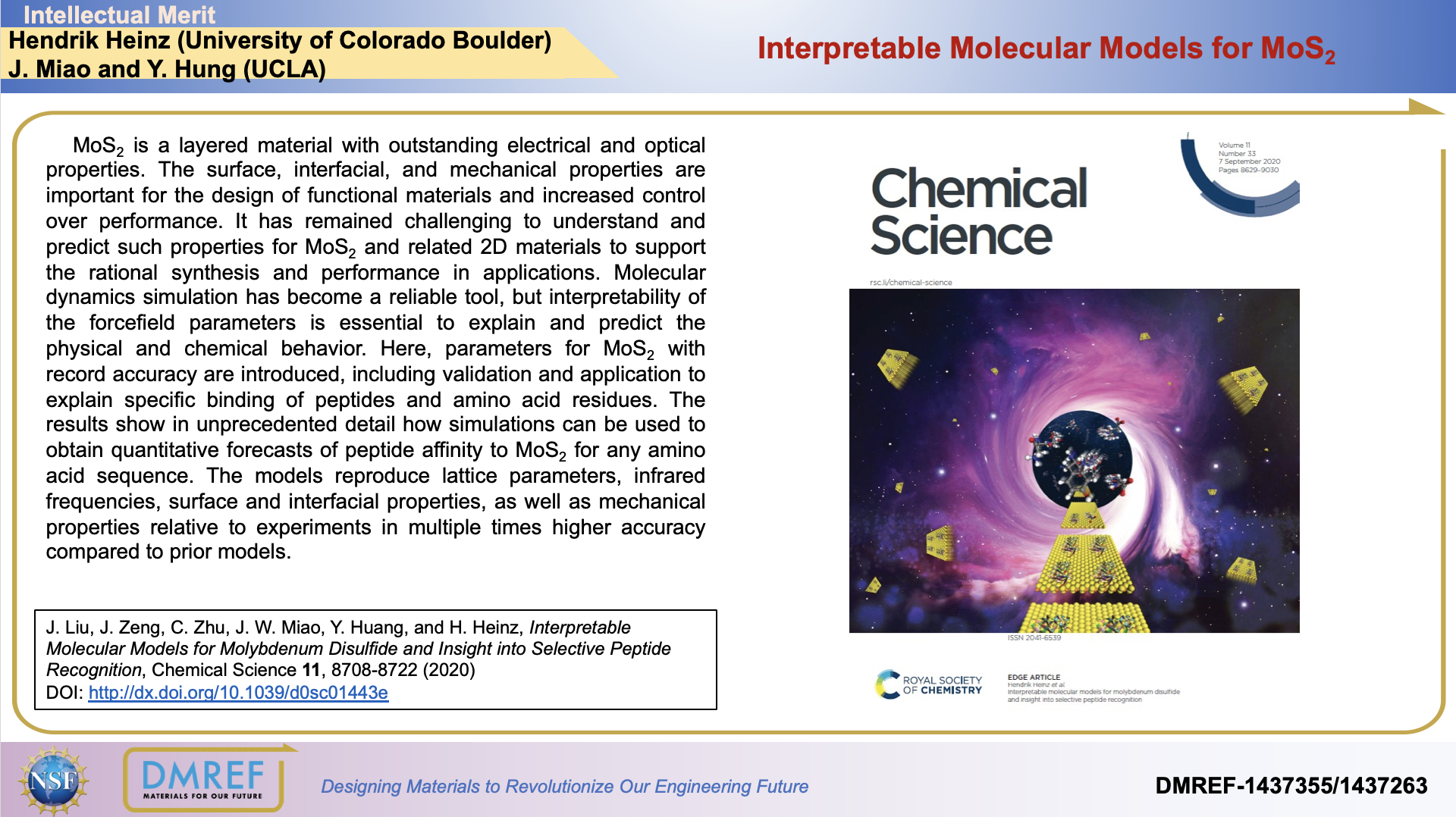 MoS2 is a layered material with outstanding electrical and optical properties. The surface, interfacial, and mechanical properties are important for the design of functional materials and increased control over performance. It has remained challenging to understand and predict such properties for MoS2 and related 2D materials to support the rational synthesis and performance in applications. Molecular dynamics simulation has become a reliable tool, but interpretability of the forcefield parameters is essential to explain and predict the physical and chemical behavior. Here, parameters for MoS2 with record accuracy are introduced, including validation and application to explain specific binding of peptides and amino acid residues. The results show in unprecedented detail how simulations can be used to obtain quantitative forecasts of peptide affinity to MoS2 for any amino acid sequence. The models reproduce lattice parameters, infrared frequencies, surface and interfacial properties, as well as mechanical properties relative to experiments in multiple times higher accuracy compared to prior models.