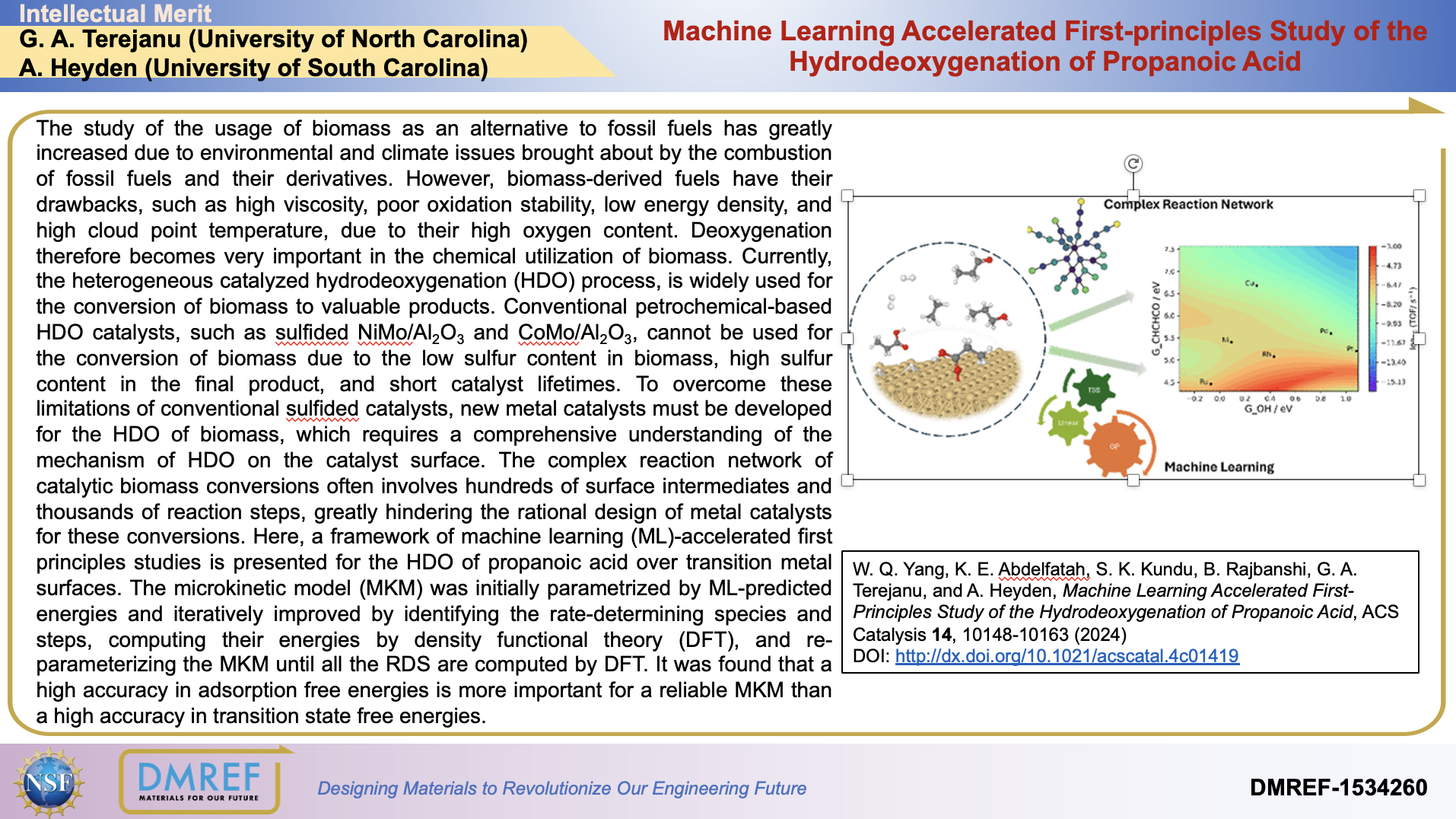 The study of the usage of biomass as an alternative to fossil fuels has greatly increased due to environmental and climate issues brought about by the combustion of fossil fuels and theirderivatives. However, biomass-derived fuels have their drawbacks, such as high viscosity, poor oxidation stability, low energy density, and high cloud point temperature, due to their high oxygen content. Deoxygenation therefore becomes very important in the chemical utilization of biomass. Currently, the heterogeneous catalyzed hydrodeoxygenation (HDO) process, is widely used for the conversion of biomass to valuable products. Conventional petrochemical-based HDO catalysts, such as sulfided NiMo/Al2O3 and CoMo/Al2O3, cannot be used for the conversion of biomass due to the low sulfur content in biomass, high sulfur content in the final product, and short catalyst lifetimes. To overcome these limitations of conventional sulfidedcatalysts, new metal catalysts must be developed for the HDO of biomass, which requires a comprehensive understanding of the mechanism of HDO on the catalyst surface. The complex reaction network of catalytic biomass conversions often involves hundreds of surface intermediates and thousands of reaction steps, greatly hindering the rational design of metal catalysts for these conversions. Here, a framework of machine learning (ML)-accelerated first principles studies is presented for the HDO of propanoic acid over transition metal surfaces. The microkinetic model (MKM) was initially parametrized by ML-predicted energies and iteratively improved by identifying the rate-determining species and steps, computing their energies by density functional theory (DFT), and re-parameterizing the MKM until all the RDS are computed by DFT. It was found that a high accuracy in adsorption free energies is more important for a reliable MKM than a high accuracy in transition state free energies.