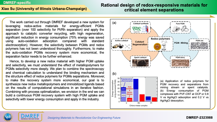 The work carried out through DMREF developed a new system for leveraging redox-active materials for energy-efficient PGMs separation (over 100 selectivity for Pt/Rh separation) and apply the approach to catalytic converter recycling, with high regeneration, significant reduction in energy consumption (75% energy was saved using auto-oxidation adsorption compared with standard electrosorption). However, the selectivity between PGMs and redox polymers has not been understood thoroughly. Furthermore, to make the auto-oxidation PGMs recovery system more economical, the separation factor needs to be further enhanced.
