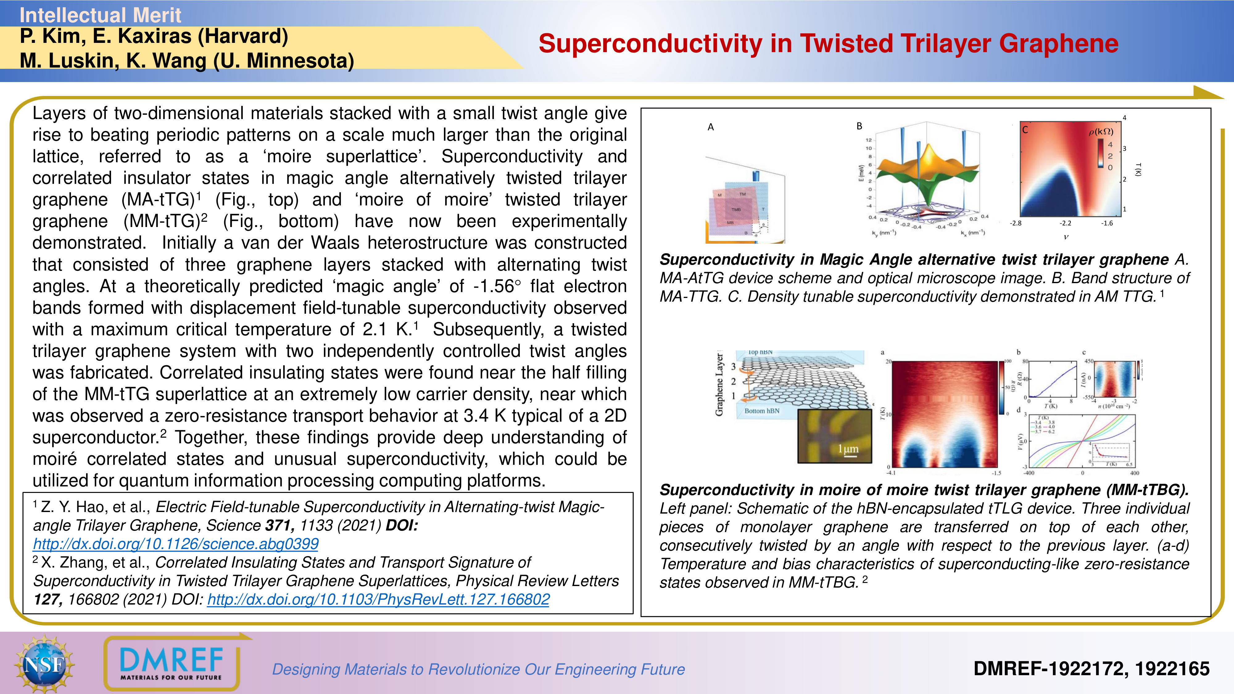 Layers of two-dimensional materials stacked with a small twist angle give rise to beating periodic patterns on a scale much larger than the original lattice, referred to as a ‘moiresuperlattice’. Superconductivity and correlated insulator states in magic angle alternatively twisted trilayer graphene (MA-tTG)1 (Fig., top) and ‘moire of moire’ twisted trilayer graphene (MM-tTG)2 (Fig., bottom) have now been experimentally demonstrated. Initially a van der Waals heterostructure was constructed that consisted of three graphene layers stacked with alternating twist angles. At a theoretically predicted ‘magic angle’ of -1.56° flat electron bands formed with displacement field-tunable superconductivity observed with a maximum critical temperature of 2.1 K.1 Subsequently, a twisted trilayer graphene system with two independently controlled twist angles was fabricated. Correlated insulating states were found near the half filling of the MM-tTG superlattice at an extremely low carrier density, near which was observed a zero-resistance transport behavior at 3.4 K typical of a 2D superconductor.2Together, these findings provide deep understanding of moiré correlated states and unusual superconductivity, which could be utilized for quantum information processing computing platforms.