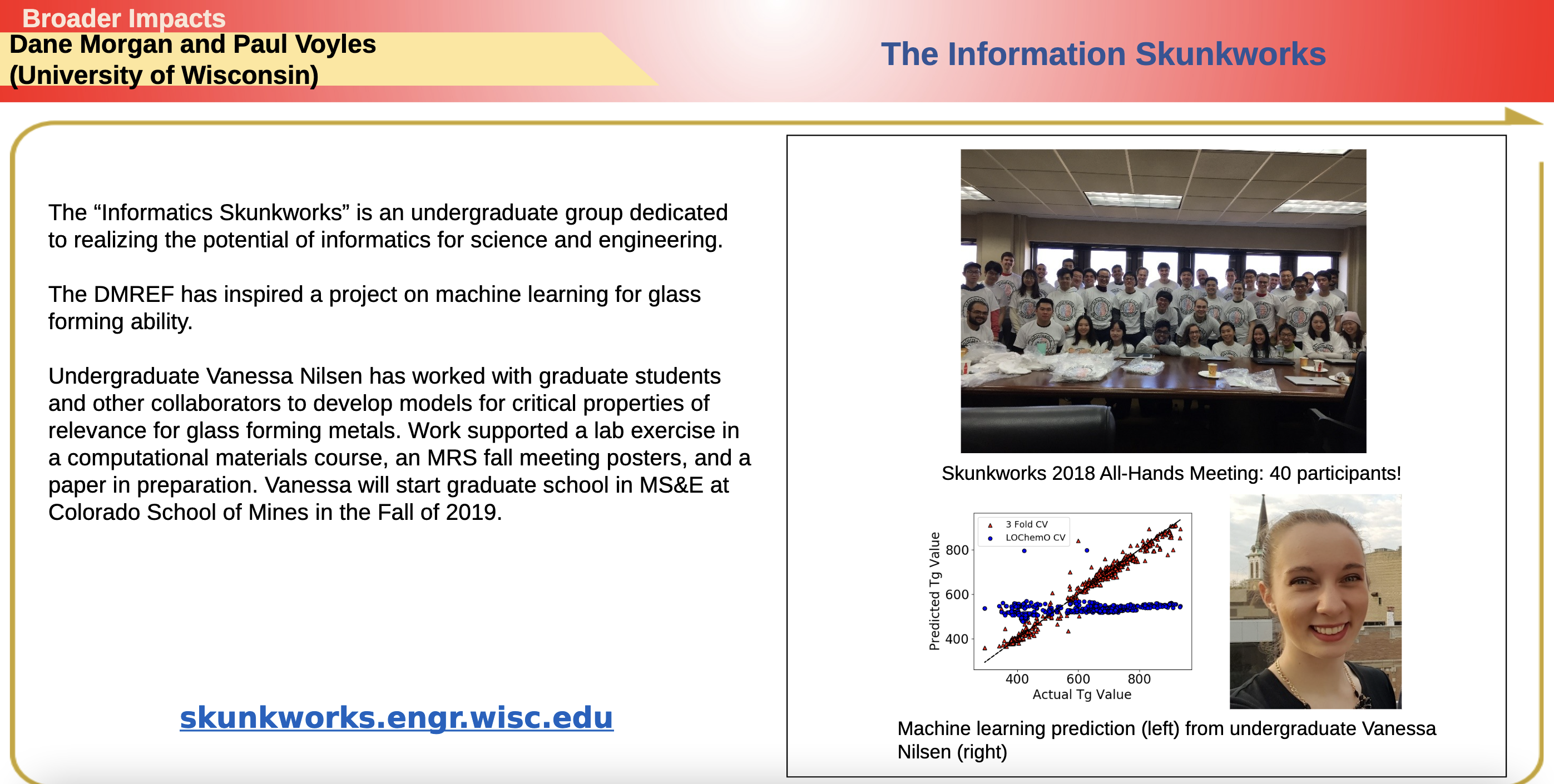 Undergraduate Vanessa Nilsen has worked with graduate students and other collaborators to develop models for critical properties of relevance for glass forming metals. Work supported a lab exercise in a computational materials course, an MRS fall meeting posters, and a paper in preparation. Vanessa will start graduate school in MS&E at Colorado School of Mines in the Fall of 2019.