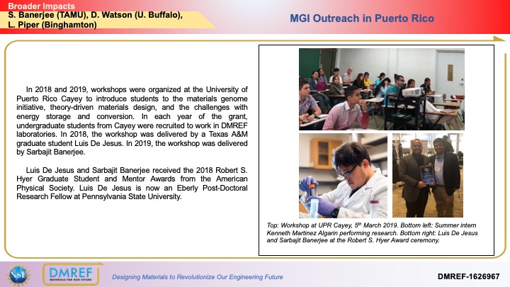 In 2018 and 2019, workshops were organized at the University of Puerto Rico Cayey to introduce students to the materials genome initiative, theory-driven materials design, and the challenges with energy storage and conversion. In each year of the grant, undergraduate students from Cayey were recruited to work in DMREF laboratories. In 2018, the workshop was delivered by a Texas A&M graduate student Luis De Jesus. In 2019, the workshop was delivered by Sarbajit Banerjee.