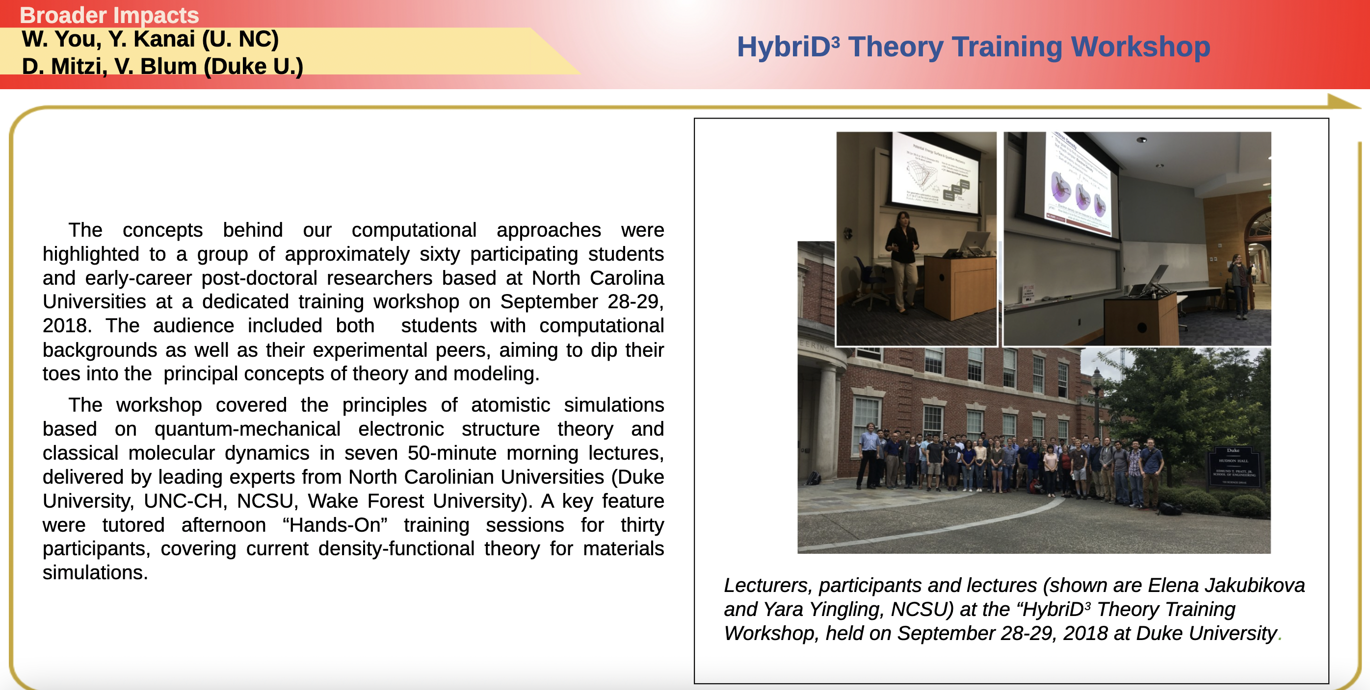 The concepts behind our computational approaches were highlighted to a group of approximately sixty participating students and early-career post-doctoral researchers based at North Carolina Universities at a dedicated training workshop on September 28-29, 2018. The audience included both students with computational backgrounds as well as their experimental peers, aiming to dip their toes into the principal concepts of theory and modeling.