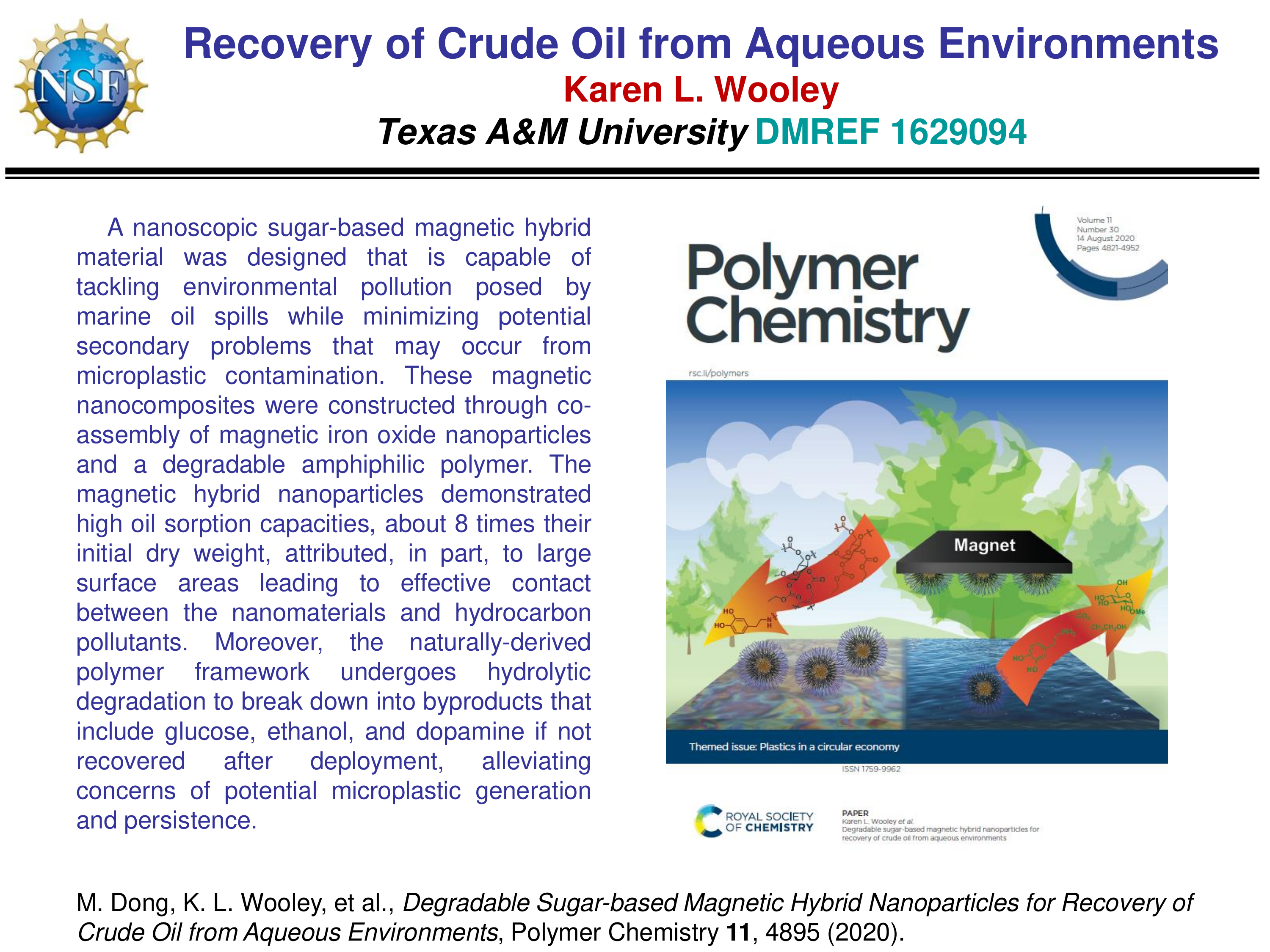 These magnetic nanocomposites were constructed through co-assembly of magnetic iron oxide nanoparticles and a degradable amphiphilic polymer. The magnetic hybrid nanoparticles demonstrated high oil sorption capacities, about 8 times their initial dry weight, attributed, in part, to large surface areas leading to effective contact between the nanomaterials and hydrocarbon pollutants. Moreover, the naturally-derived polymer framework undergoes hydrolytic degradation to break down into byproducts that include glucose, ethanol, and dopamine if not recovered after deployment, alleviating concerns of potential microplastic generation and persistence.