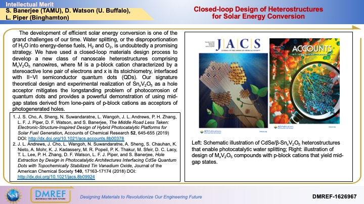 The development of efficient solar energy conversion is one of the grand challenges of our time. Water splitting, or the disproportionation of H2O into energy-dense fuels, H2 and O2, is undoubtedly a promising strategy. We have used a closed-loop materials design process to develop a new class of nanoscale heterostructures comprising MxV2O5 nanowires, where M is a p-block cation characterized by a stereoactive lone pair of electrons and x is its stoichiometry, interfaced with II−VI semiconductor quantum dots (QDs). Our signature theoretical design and experimental realization of SnxV2O5 as a hole acceptor mitigates the longstanding problem of photocorrosion of quantum dots and provides a powerful demonstration of using mid-gap states derived from lone-pairs of p-block cations as acceptors of photogenerated holes.