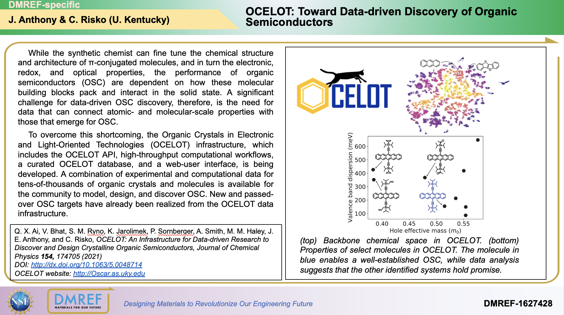To overcome this shortcoming, the Organic Crystals in Electronic and Light-Oriented Technologies (OCELOT) infrastructure, which includes the OCELOT API, high-throughput computational workflows, a curated OCELOT database, and a web-user interface, is being developed. A combination of experimental and computational data for tens-of-thousands of organic crystals and molecules is available for the community to model, design, and discover OSC. New and passed-over OSC targets have already been realized from the OCELOT data infrastructure.