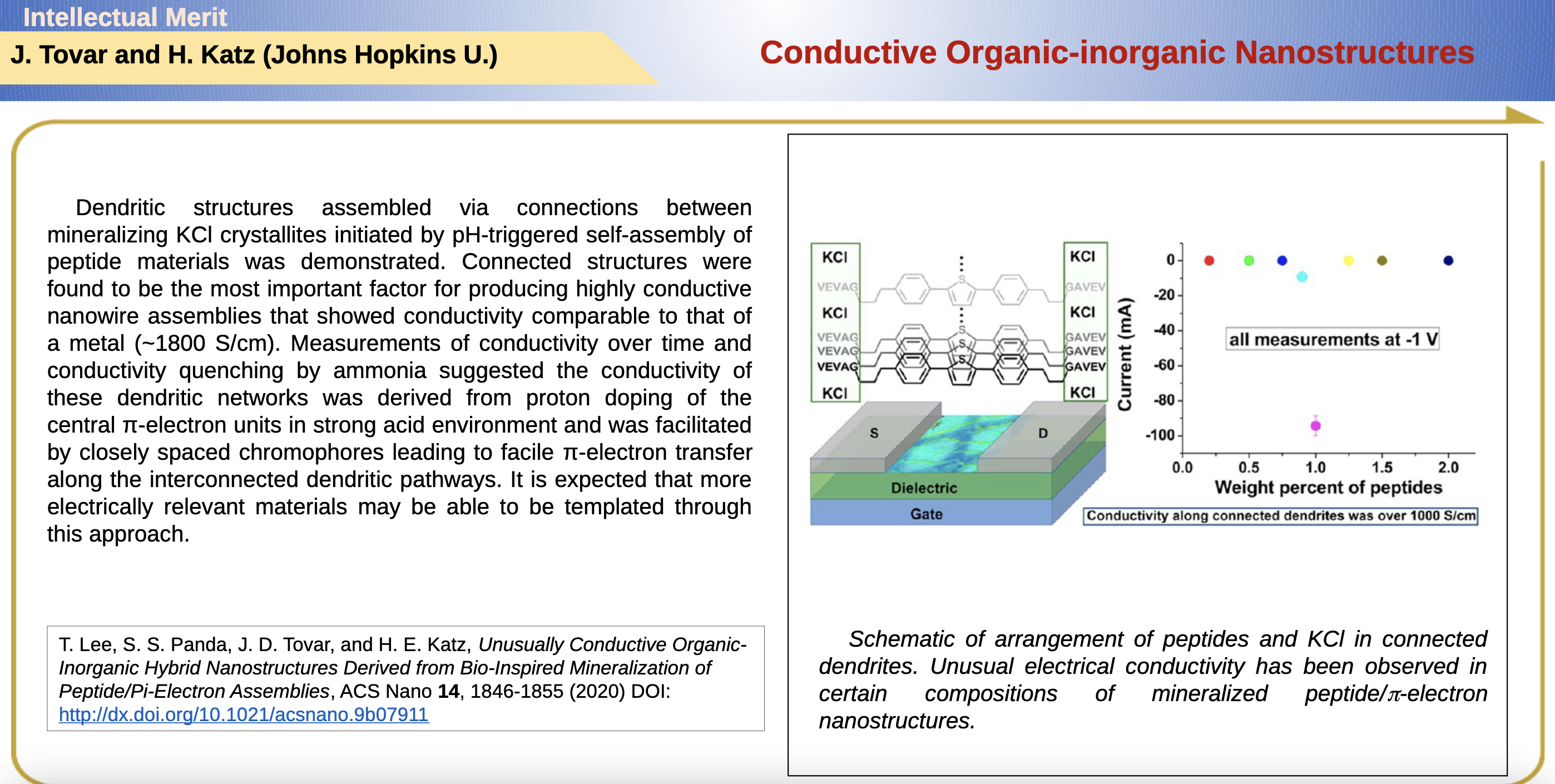 Dendritic structures assembled via connections between mineralizing KCl crystallites initiated by pH-triggered self-assembly of peptide materials was demonstrated. Connected structures were found to be the most important factor for producing highly conductive nanowire assemblies that showed conductivity comparable to that of a metal (~1800 S/cm).