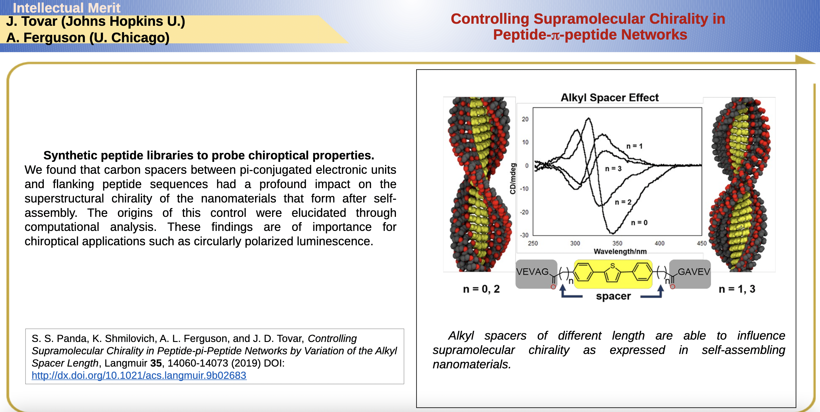 We found that carbon spacers between pi-conjugated electronic units and flanking peptide sequences had a profound impact on the superstructural chirality of the nanomaterials that form after self-assembly. The origins of this control were elucidated through computational analysis. These findings are of importance for chiroptical applications such as circularly polarized luminescence.