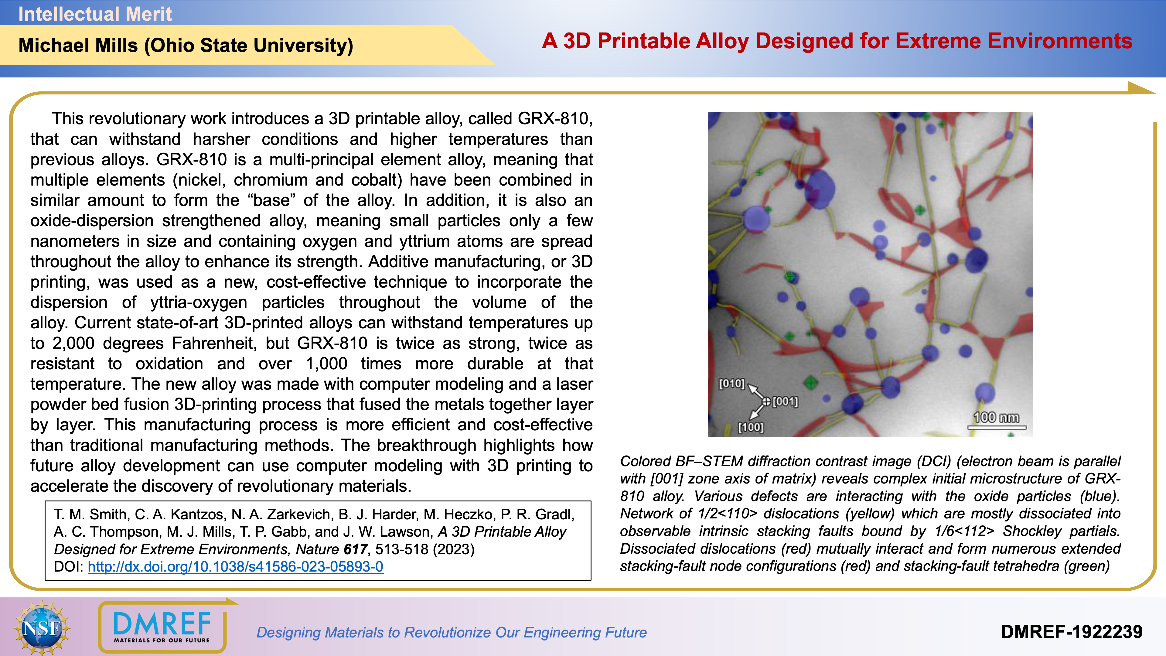 This revolutionary work introduces a 3D printable alloy, called GRX-810, that can withstand harsher conditions and higher temperatures than previous alloys. GRX-810 is a multi-principal element alloy, meaning that multiple elements (nickel, chromium and cobalt) have been combined in similar amount to form the “base” of the alloy.