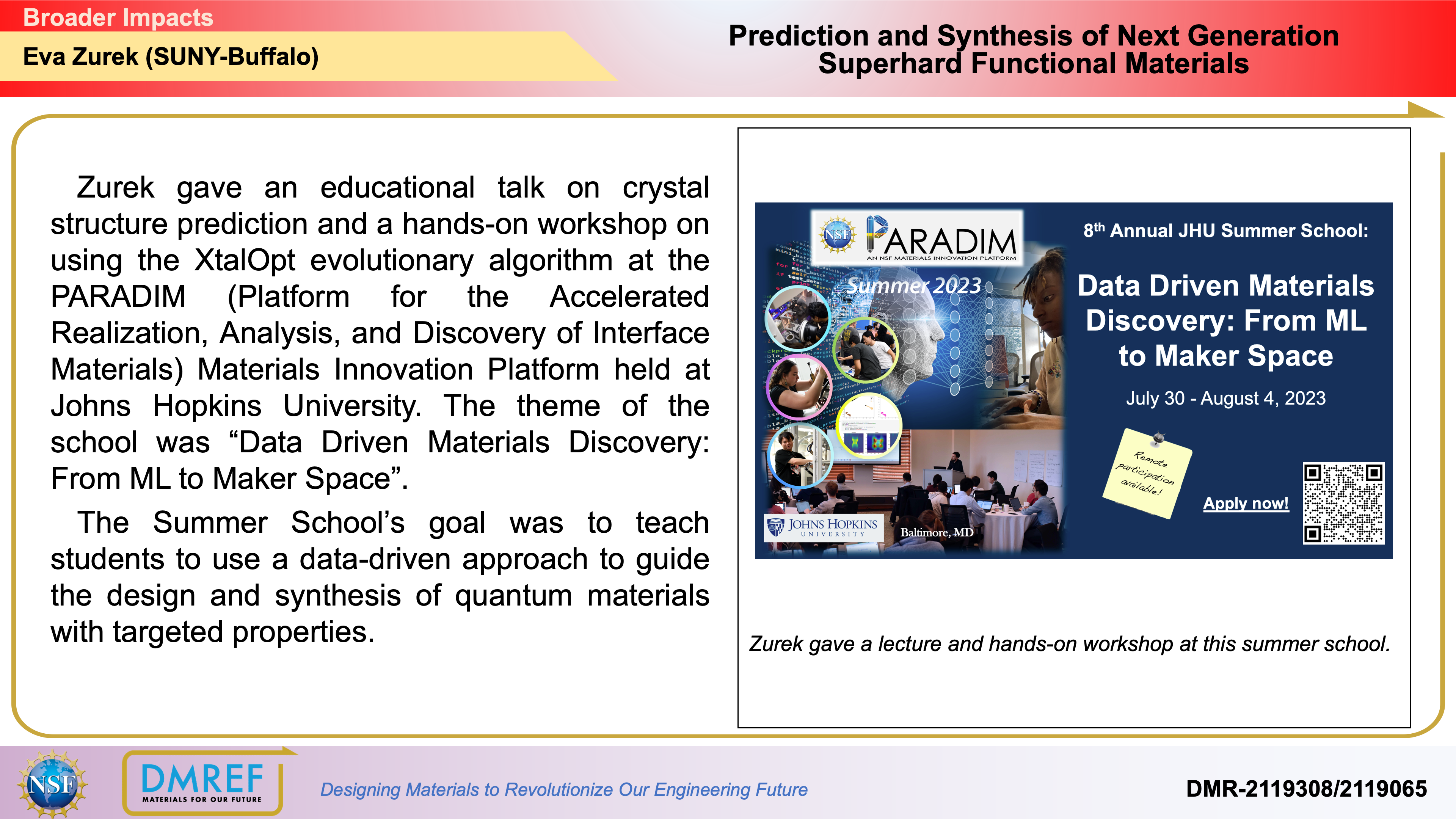 Zurek gave an educational talk on crystal structure prediction and a hands-on workshop on using the XtalOpt evolutionary algorithm at the PARADIM (Platform for the Accelerated Realization, Analysis, and Discovery of Interface Materials) Materials Innovation Platform held at Johns Hopkins University. The theme of the school was “Data Driven Materials Discovery: From ML to Maker Space”.