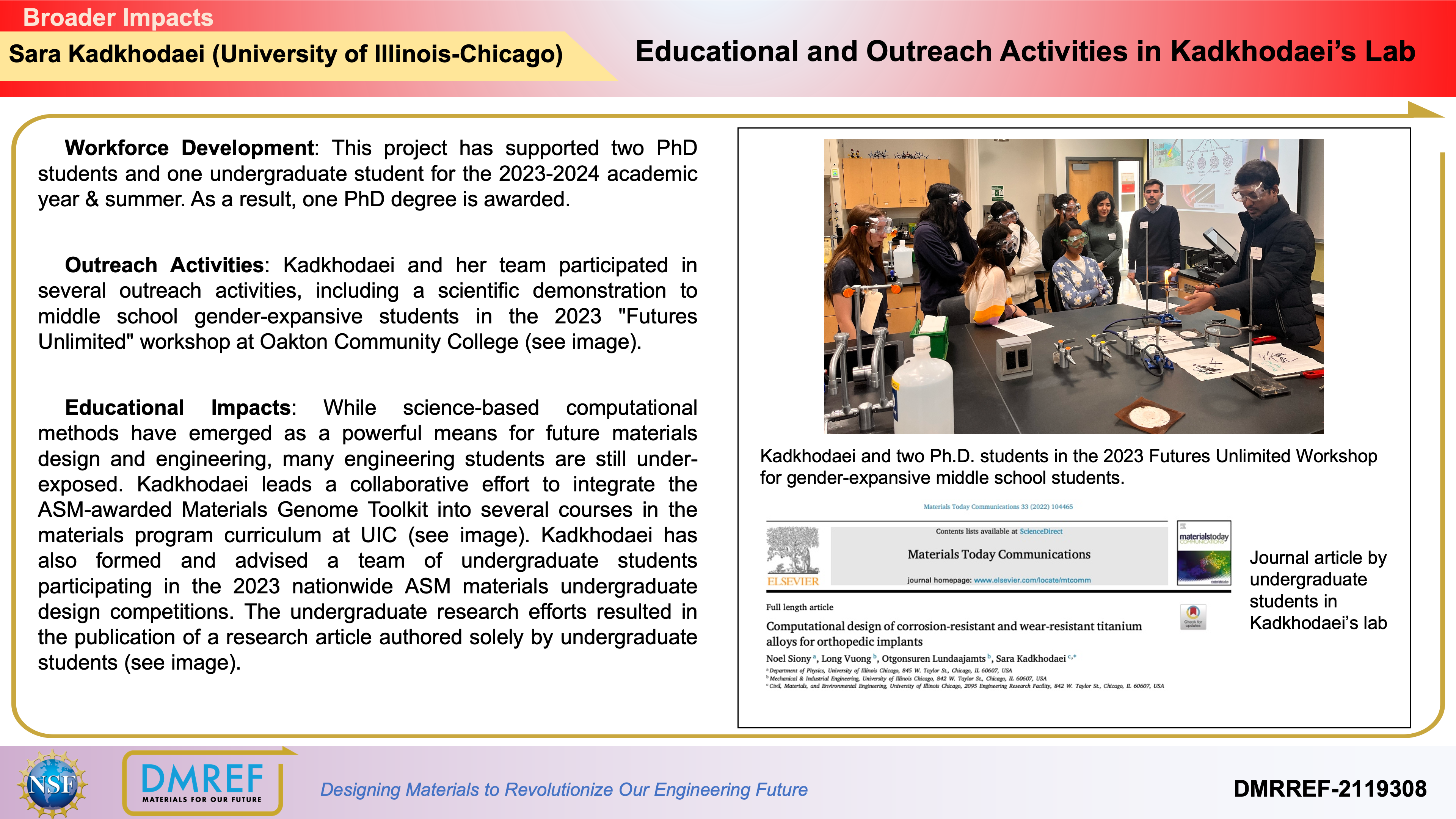 While science-based computational methods have emerged as a powerful means for future materials design and engineering, many engineering students are still under-exposed. Kadkhodaei leads a collaborative effort to integrate the ASM-awarded Materials Genome Toolkit into several courses in the materials program curriculum at UIC (see image). Kadkhodaei has also formed and advised a team of undergraduate students participating in the 2023 nationwide ASM materials undergraduate design competitions. The undergraduate research efforts resulted in the publication of a research article authored solely by undergraduate students (see image).