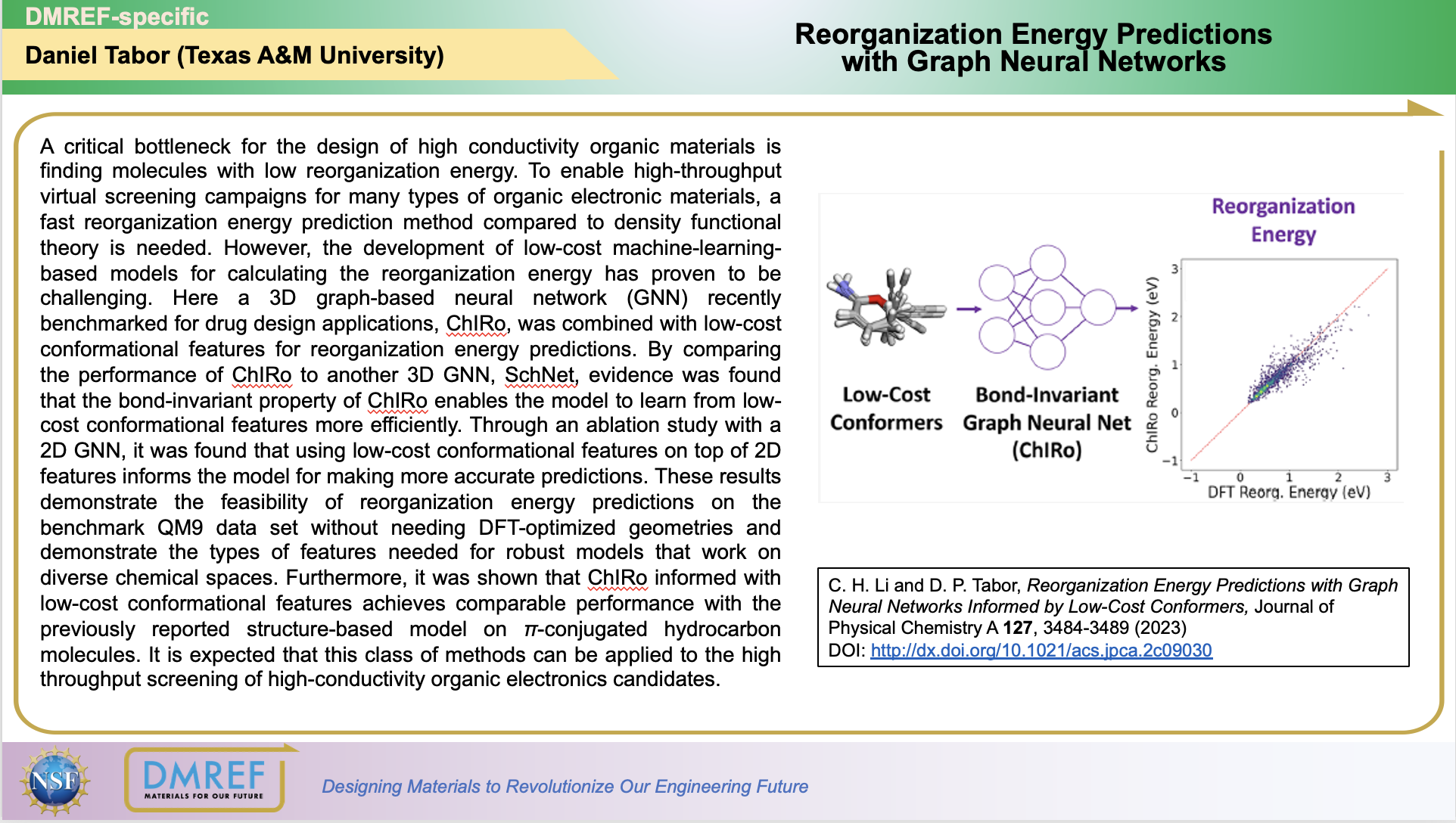 A critical bottleneck for the design of high conductivity organic materials is finding molecules with low reorganization energy. To enable high-throughput virtual screening campaigns for many types of organic electronic materials, a fast reorganization energy prediction method compared to density functional theory is needed. However, the development of low-cost machine-learning-based models for calculating the reorganization energy has proven to be challenging. Here a 3D graph-based neural network (GNN) recently benchmarked for drug design applications, ChIRo, was combined with low-cost conformational features for reorganization energy predictions. By comparing the performance of ChIRo to another 3D GNN, SchNet, evidence was found that the bond-invariant property of ChIRo enables the model to learn from low-cost conformational features more efficiently. Through an ablation study with a 2D GNN, it was found that using low-cost conformational features on top of 2D features informs the model for making more accurate predictions. These results demonstrate the feasibility of reorganization energy predictions on the benchmark QM9 data set without needing DFT-optimized geometries and demonstrate the types of features needed for robust models that work on diverse chemical spaces. Furthermore, it was shown that ChIRo informed with low-cost conformational features achieves comparable performance with the previously reported structure-based model on π-conjugated hydrocarbon molecules. It is expected that this class of methods can be applied to the high throughput screening of high-conductivity organic electronics candidates.