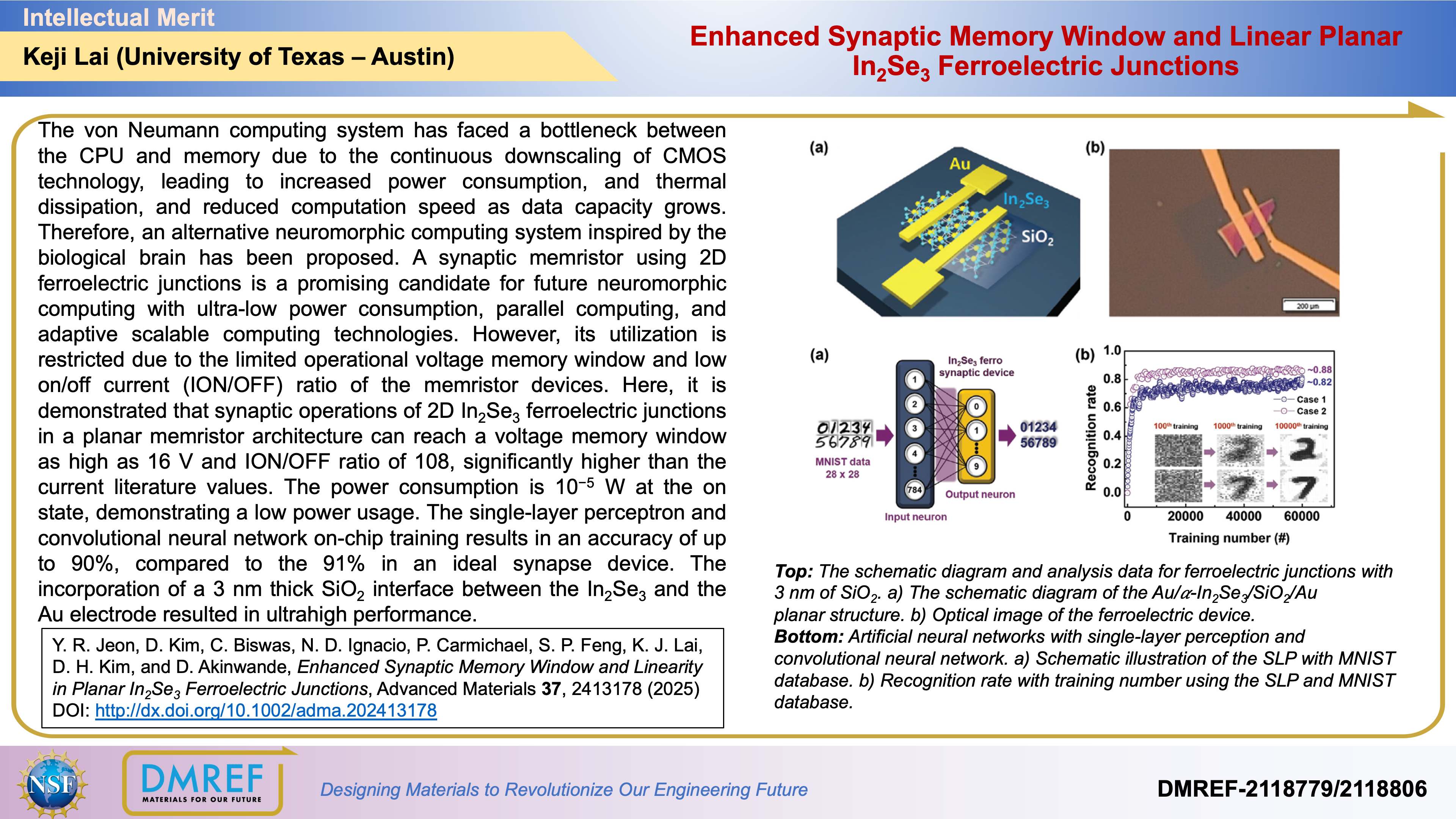 Here, it is demonstrated that synaptic operations of 2D In2Se3 ferroelectric junctions in a planar memristor architecture can reach a voltage memory window as high as 16 V and ION/OFF ratio of 108, significantly higher than the current literature values. The power consumption is 10−5 W at the on state, demonstrating a low power usage. The single-layer perceptron and convolutional neural network on-chip training results in an accuracy of up to 90%, compared to the 91% in an ideal synapse device. The incorporation of a 3 nm thick SiO2interface between the In2Se3 and the Au electrode resulted in ultrahigh performance.