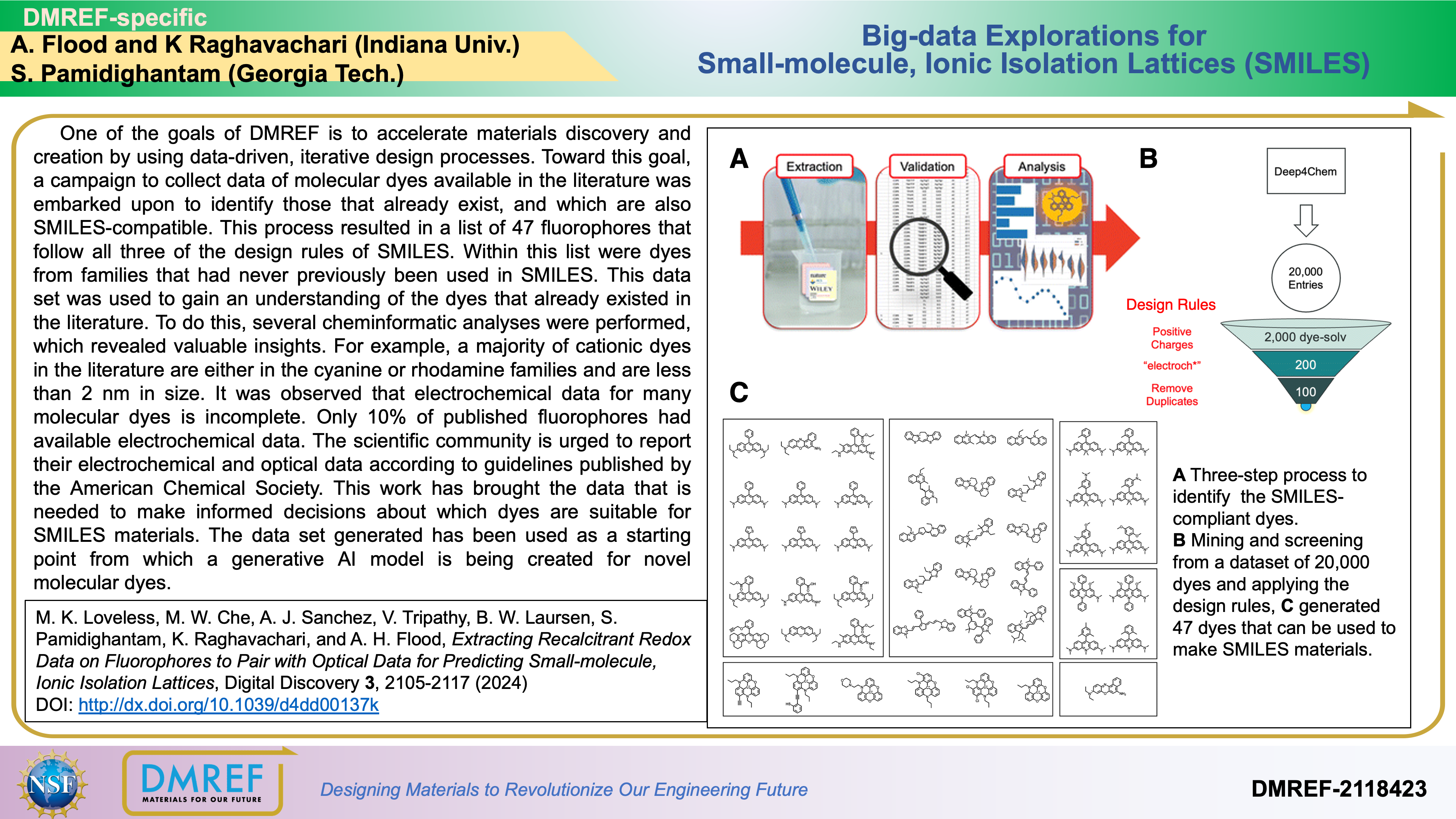 One of the goals of DMREF is to accelerate materials discovery and creation by using data-driven, iterative design processes. Toward this goal, a campaign to collect data of molecular dyes available in the literature was embarked upon to identify those that already exist, and which are also SMILES-compatible.
