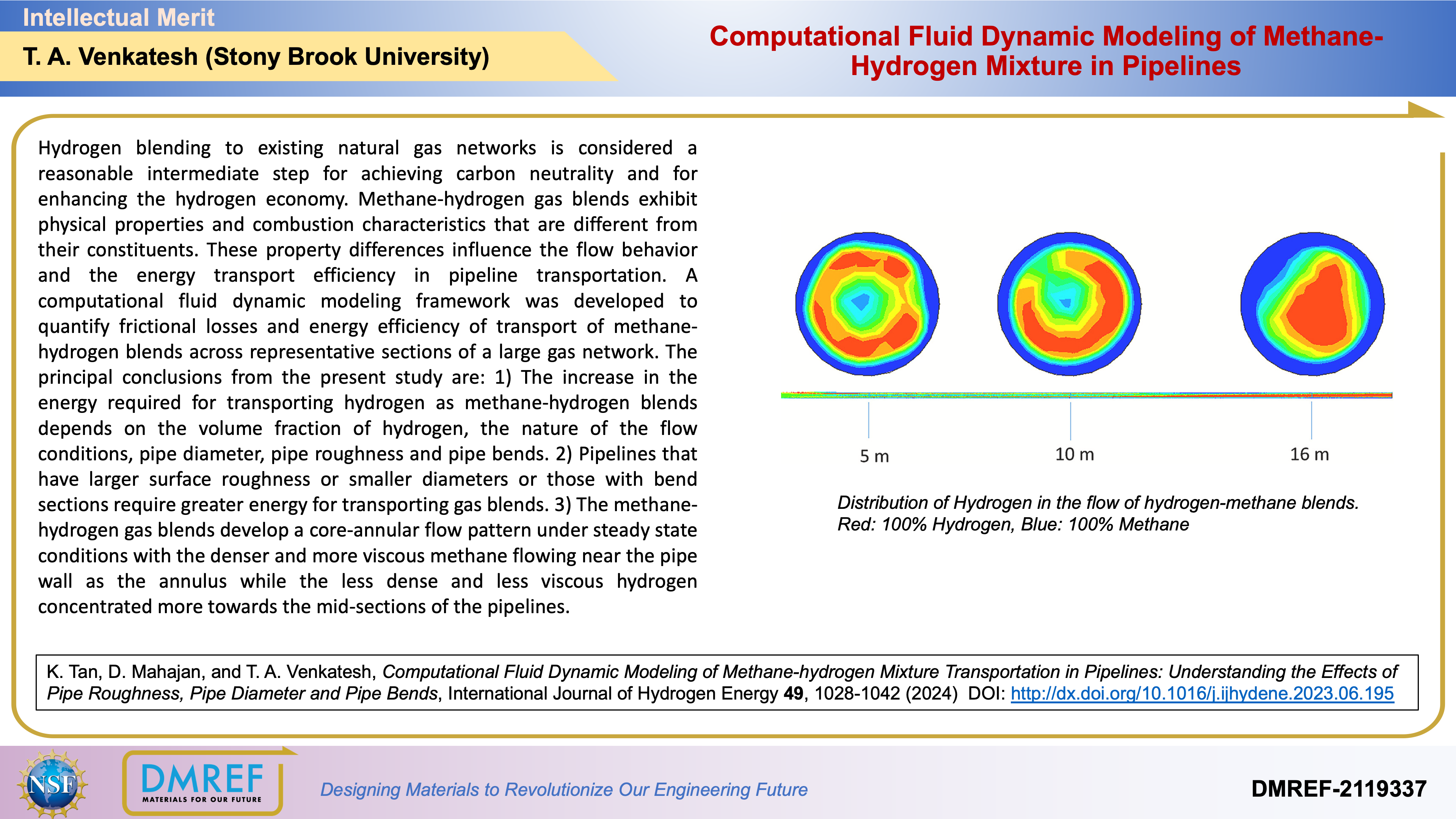 The methane-hydrogen gas blends develop a core-annular flow pattern under steady state conditions with the denser and more viscous methane flowing near the pipe wall as the annulus while the less dense and less viscous hydrogen concentrated more towards the mid-sections of the pipelines.