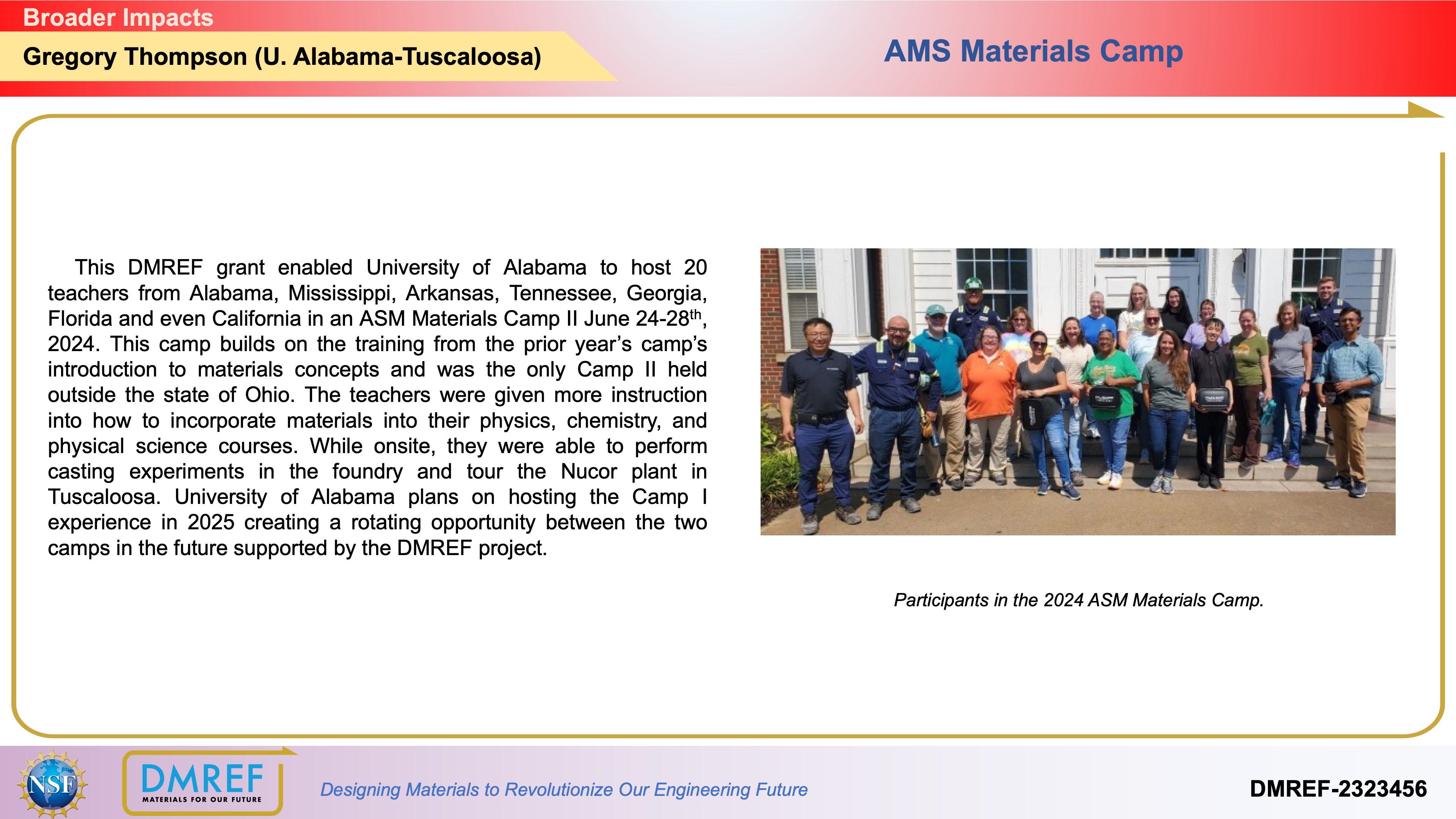 This DMREF grant enabled University of Alabama to host 20 teachers from Alabama, Mississippi, Arkansas, Tennessee, Georgia, Florida and even California in an ASM Materials Camp II June 24-28th, 2024. This camp builds on the training from the prior year’s camp’s introduction to materials concepts and was the only Camp II held outside the state of Ohio.