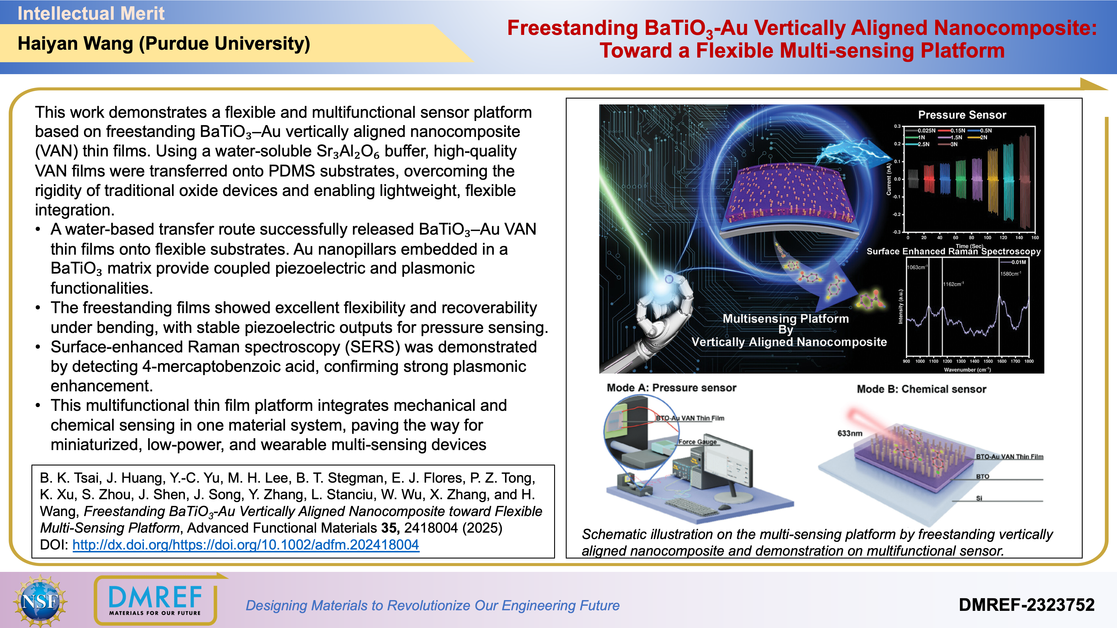 This work demonstrates a flexible and multifunctional sensor platform based on freestanding BaTiO₃–Au vertically aligned nanocomposite (VAN) thin films. Using a water-soluble Sr₃Al₂O₆ buffer, high-quality VAN films were transferred onto PDMS substrates, overcoming the rigidity of traditional oxide devices and enabling lightweight, flexible integration.