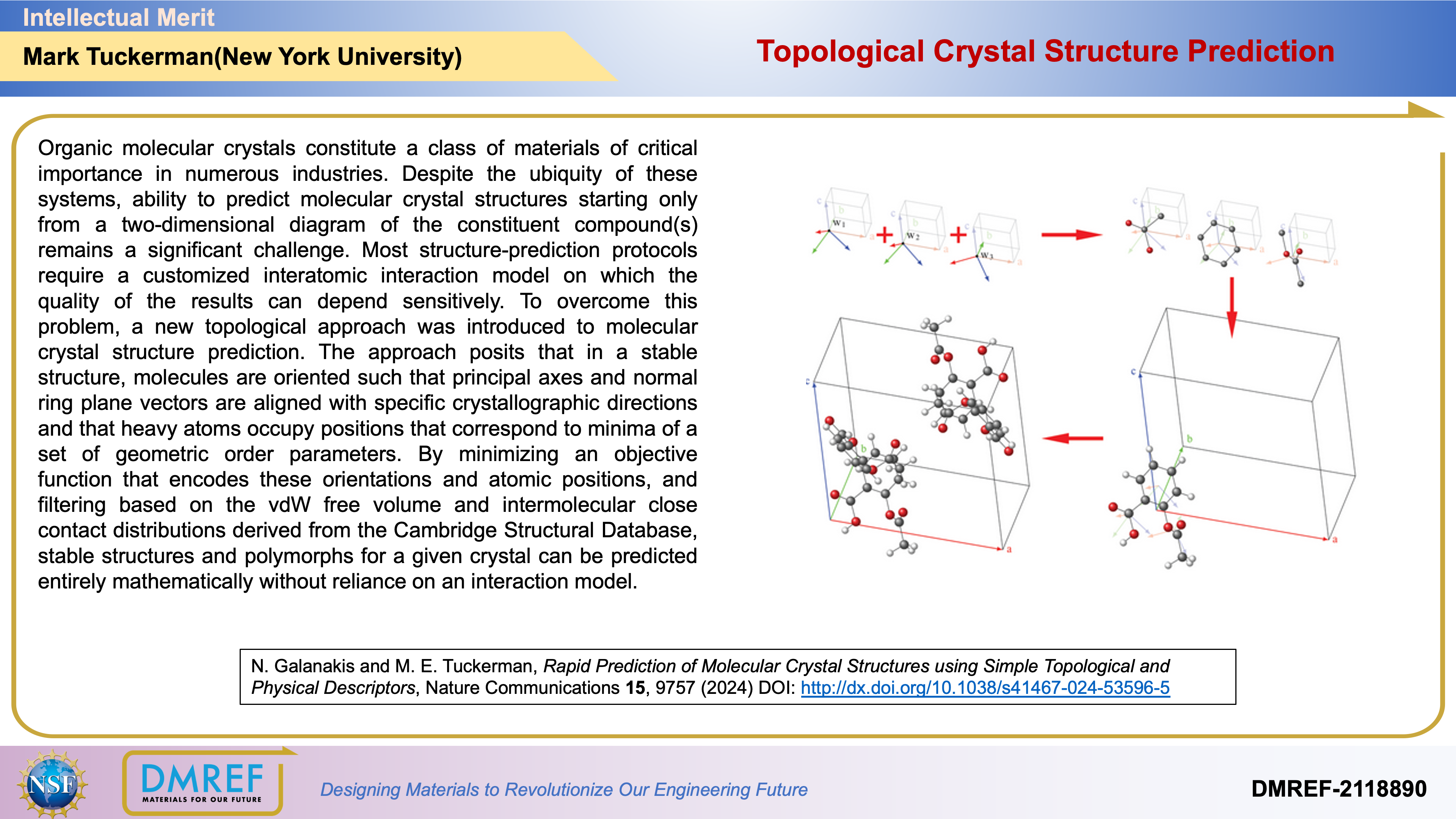 To overcome this problem, a new topological approach was introduced to molecular crystal structure prediction. The approach posits that in a stable structure,molecules are oriented such that principal axes and normal ring plane vectors are aligned with specific crystallographic directions and that heavy atoms occupy positions that correspond to minima of a set of geometric order parameters.