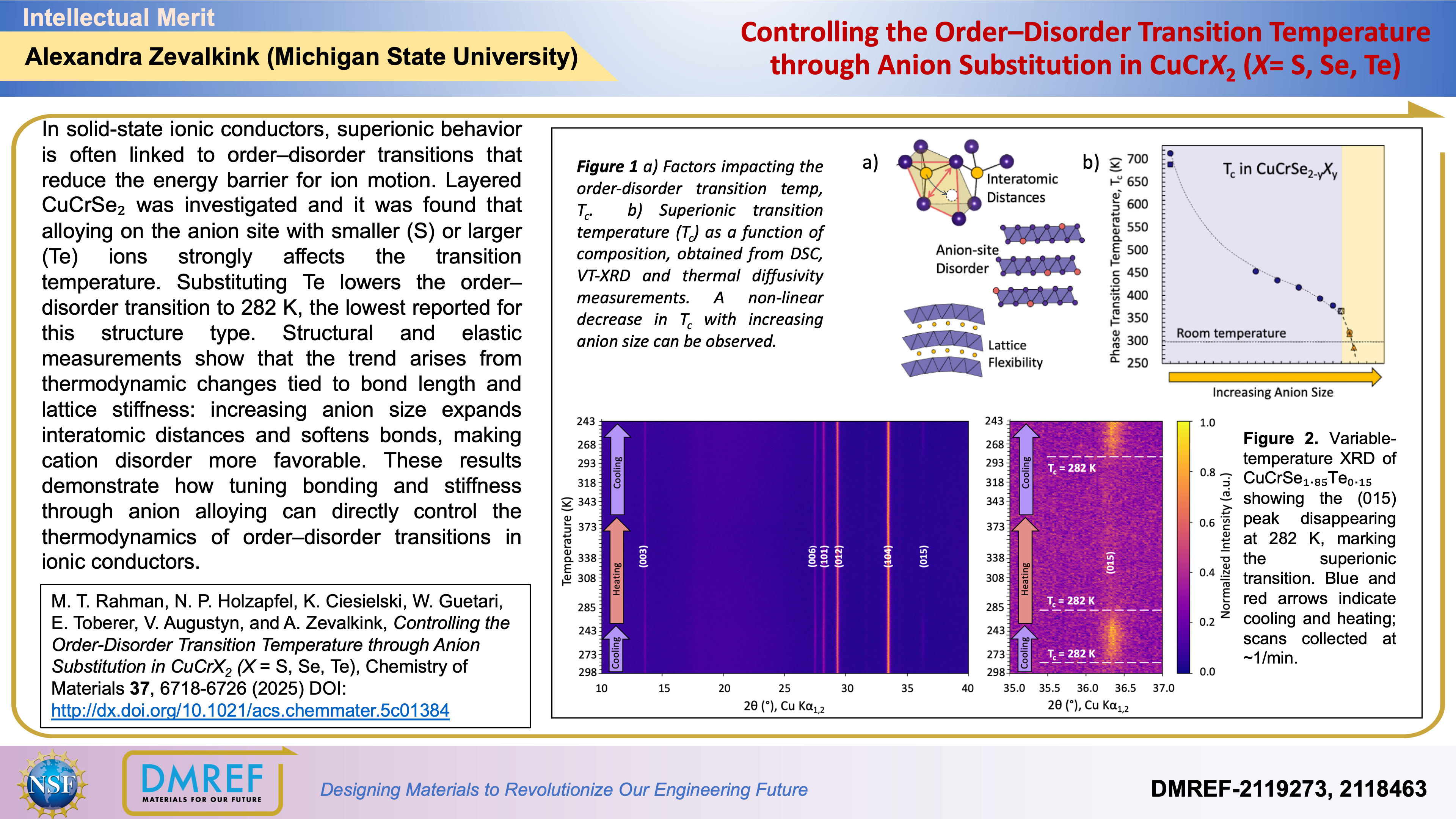 In solid-state ionic conductors, superionic behavior is often linked to order–disorder transitions that reduce the energy barrier for ion motion. Layered CuCrSe₂ was investigated and it was found that alloying on the anion site with smaller (S) or larger (Te) ions strongly affects the transition temperature. Substituting Te lowers the order–disorder transition to 282 K, the lowest reported for this structure type.