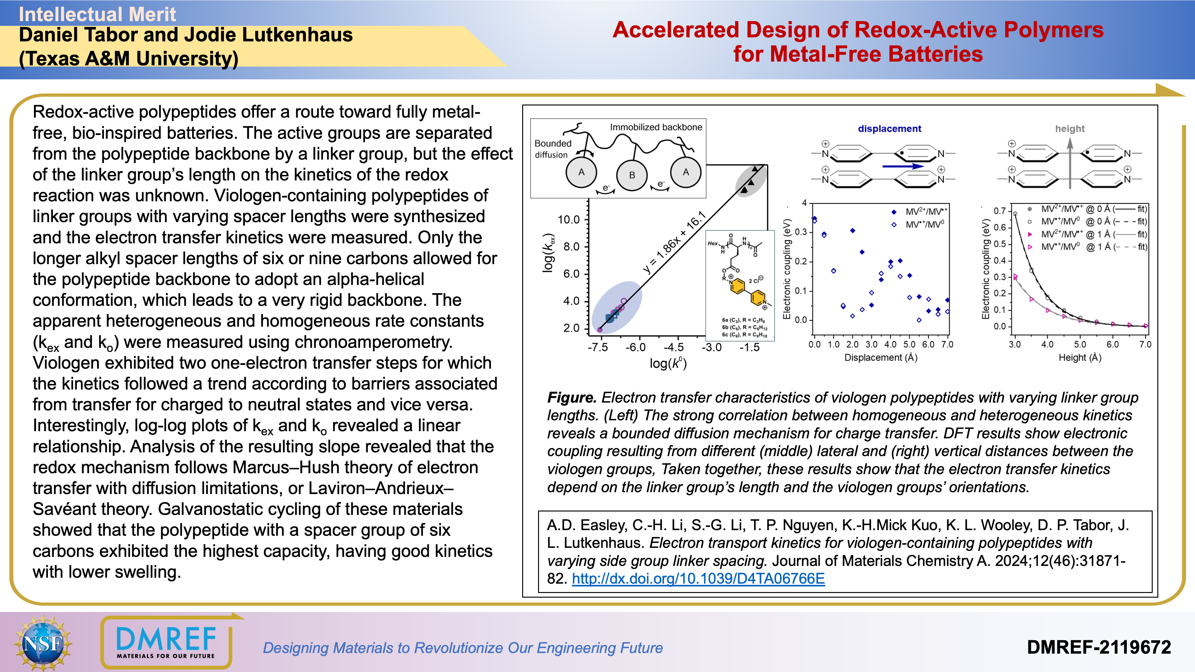 Redox-active polypeptides offer a route toward fully metal-free, bio-inspired batteries. The active groups are separated from the polypeptide backbone by a linker group, but the effect of the linker group’s length on the kinetics of the redox reaction was unknown. Viologen-containing polypeptides of linker groups with varying spacer lengths were synthesized and the electron transfer kinetics were measured. Only the longer alkyl spacer lengths of six or nine carbons allowed for the polypeptide backbone to adopt an alpha-helical conformation, which leads to a very rigid backbone.