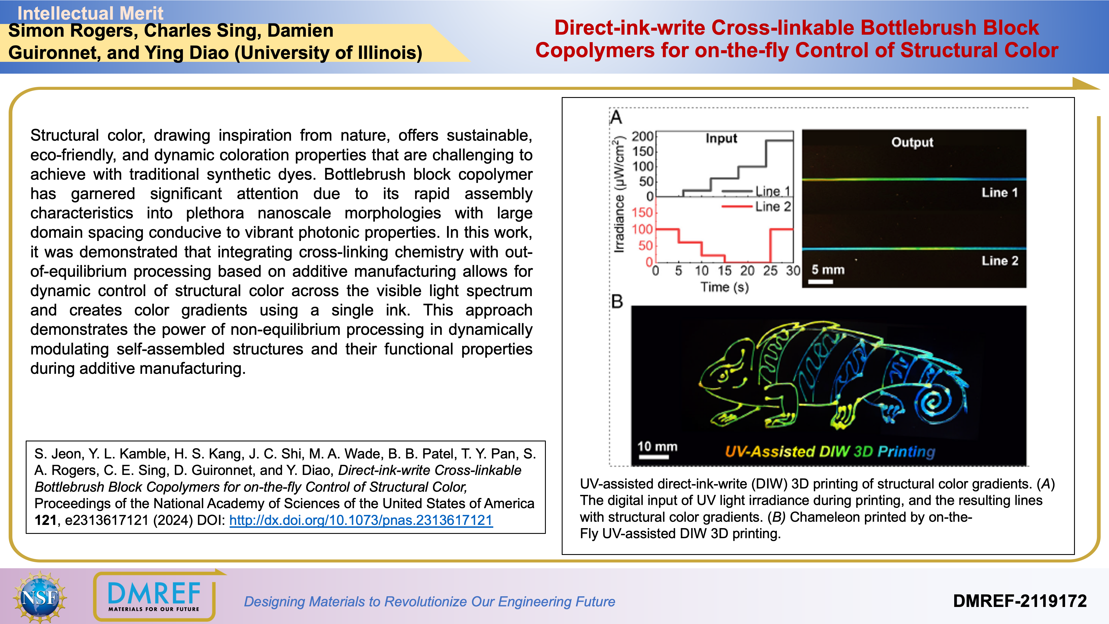In this work, it was demonstrated that integrating cross-linking chemistry with out-of-equilibrium processing based on additive manufacturing allows for dynamic control of structural color across the visible light spectrum and creates color gradients using a single ink. This approach demonstrates the power of non-equilibrium processing in dynamically modulating self-assembled structures and their functional properties during additive manufacturing.