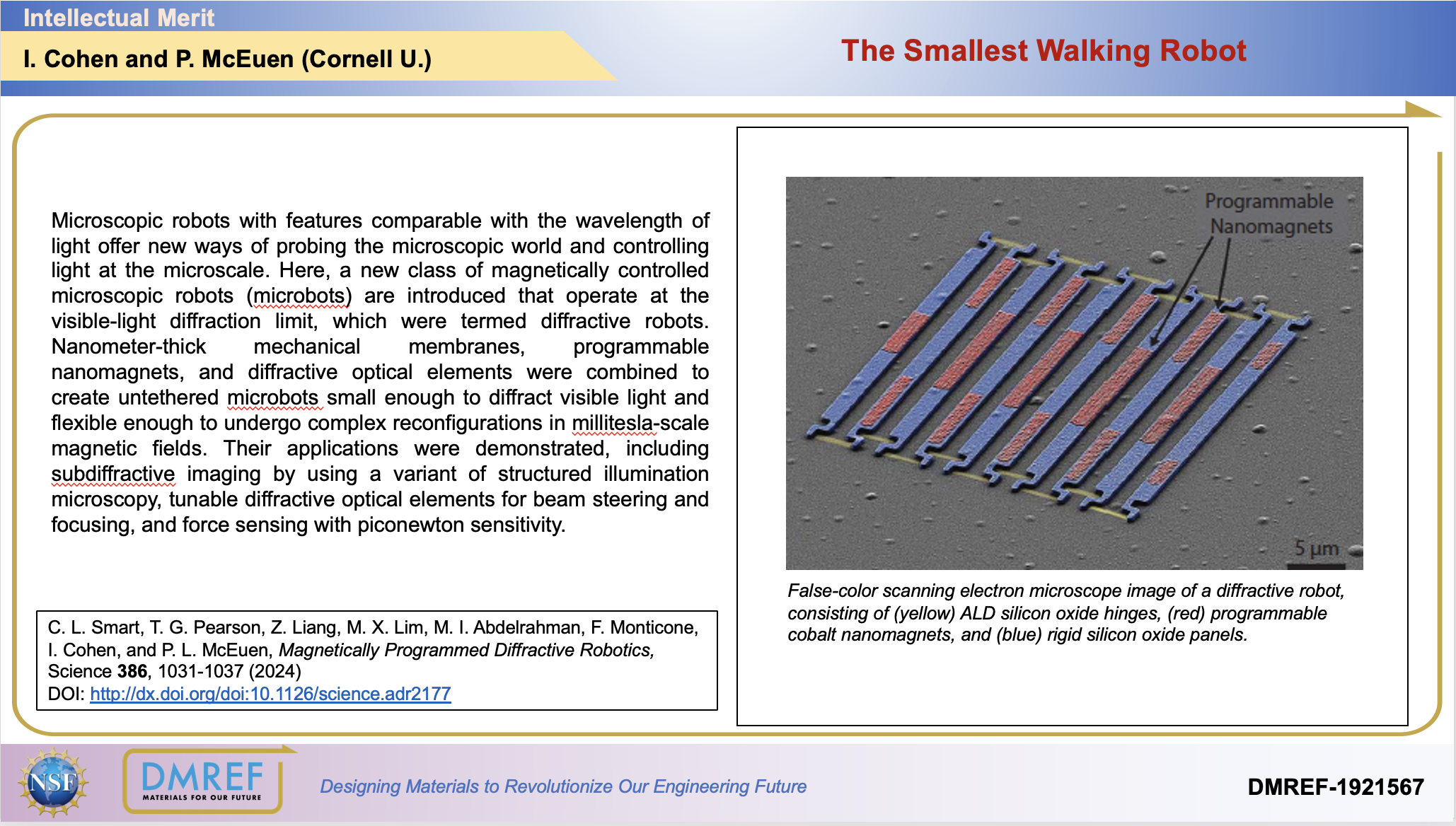 Microscopic robots with features comparable with the wavelength of light offer new ways of probing the microscopic world and controlling light at the microscale. Here, a new class of magnetically controlled microscopic robots (microbots) are introduced that operate at the visible-light diffraction limit, which were termed diffractive robots. Nanometer-thick mechanical membranes, programmable nanomagnets, and diffractive optical elements were combined to create untethered microbots small enough to diffract visible light and flexible enough to undergo complex reconfigurations in millitesla-scale magnetic fields. Their applications were demonstrated, including subdiffractive imaging by using a variant of structured illumination microscopy, tunable diffractive optical elements for beam steering and focusing, and force sensing with piconewton sensitivity.