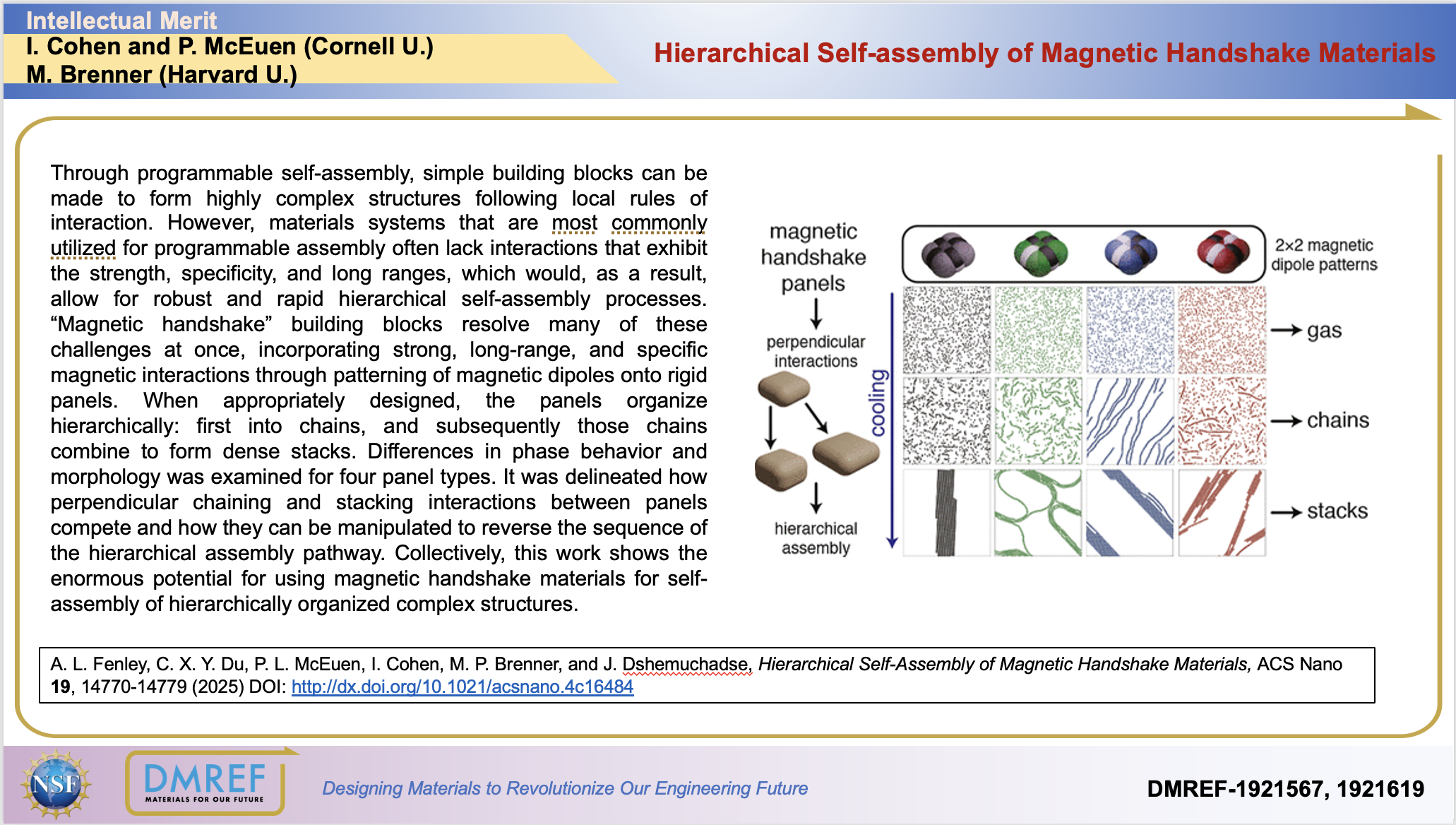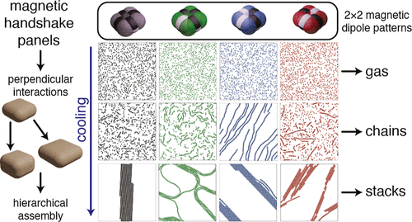 Through programmable self-assembly, simple building blocks can be made to form highly complex structures following local rules of interaction. However, materials systems that are most commonly utilized for programmable assembly often lack interactions that exhibit the strength, specificity, and long ranges, which would, as a result, allow for robust and rapid hierarchical self-assembly processes. “Magnetic handshake” building blocks resolve many of these challenges at once, incorporating strong, long-range, and specific magnetic interactions through patterning of magnetic dipoles onto rigid panels. When appropriately designed, the panels organize hierarchically: first into chains, and subsequently those chains combine to form dense stacks. Differences in phase behavior and morphology was examined for four panel types. It was delineated how perpendicular chaining and stacking interactions between panels compete and how they can be manipulated to reverse the sequence of the hierarchical assembly pathway. Collectively, this work shows the enormous potential for using magnetic handshake materials for self-assembly of hierarchically organized complex structures.