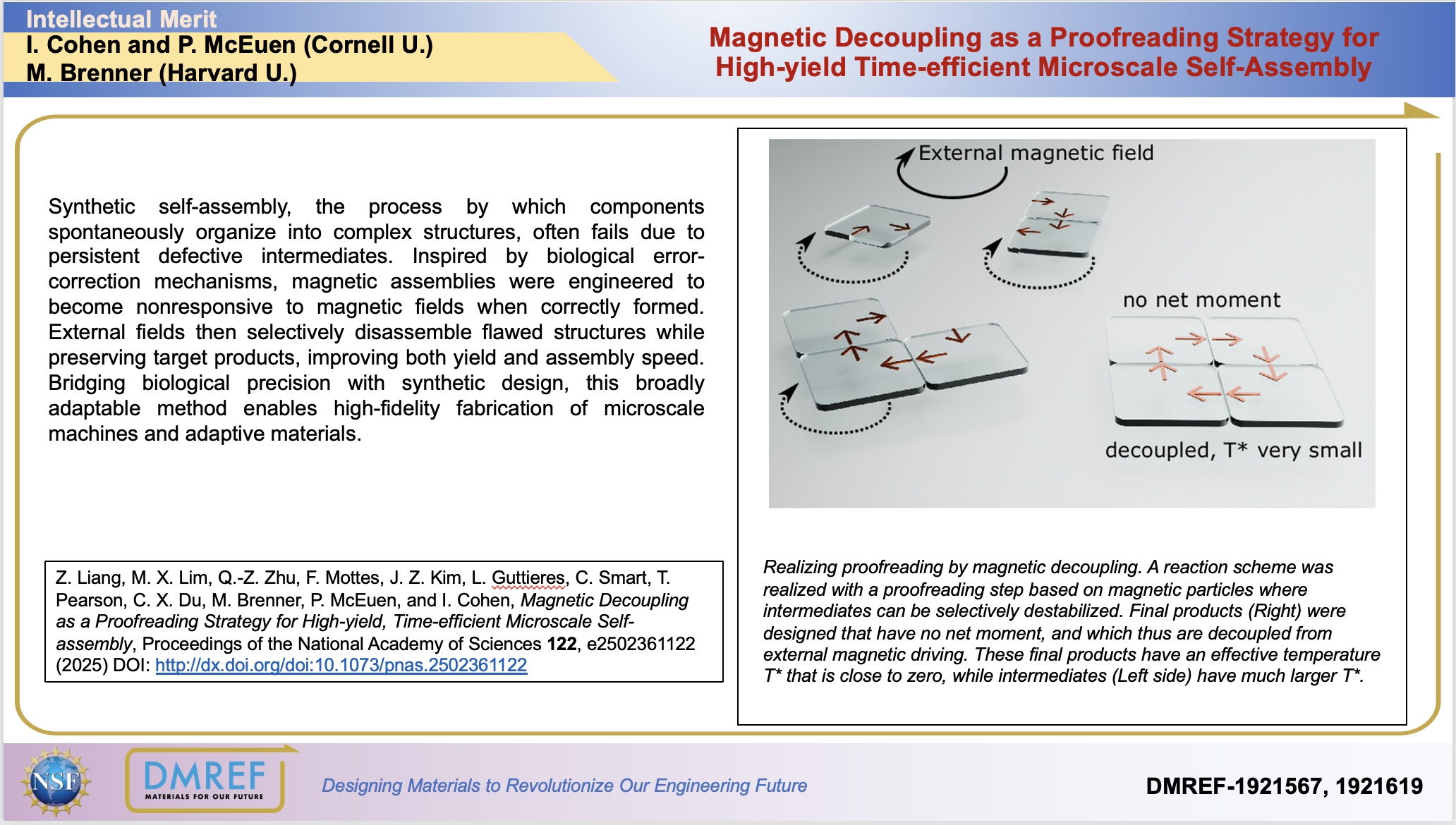 Synthetic self-assembly, the process by which components spontaneously organize into complex structures, often fails due to persistent defective intermediates. Inspired by biological error-correction mechanisms, magnetic assemblies were engineered to become nonresponsive to magnetic fields when correctly formed. External fields then selectively disassemble flawed structures while preserving target products, improving both yield and assembly speed. Bridging biological precision with synthetic design, this broadly adaptable method enables high-fidelity fabrication of microscale machines and adaptive materials.