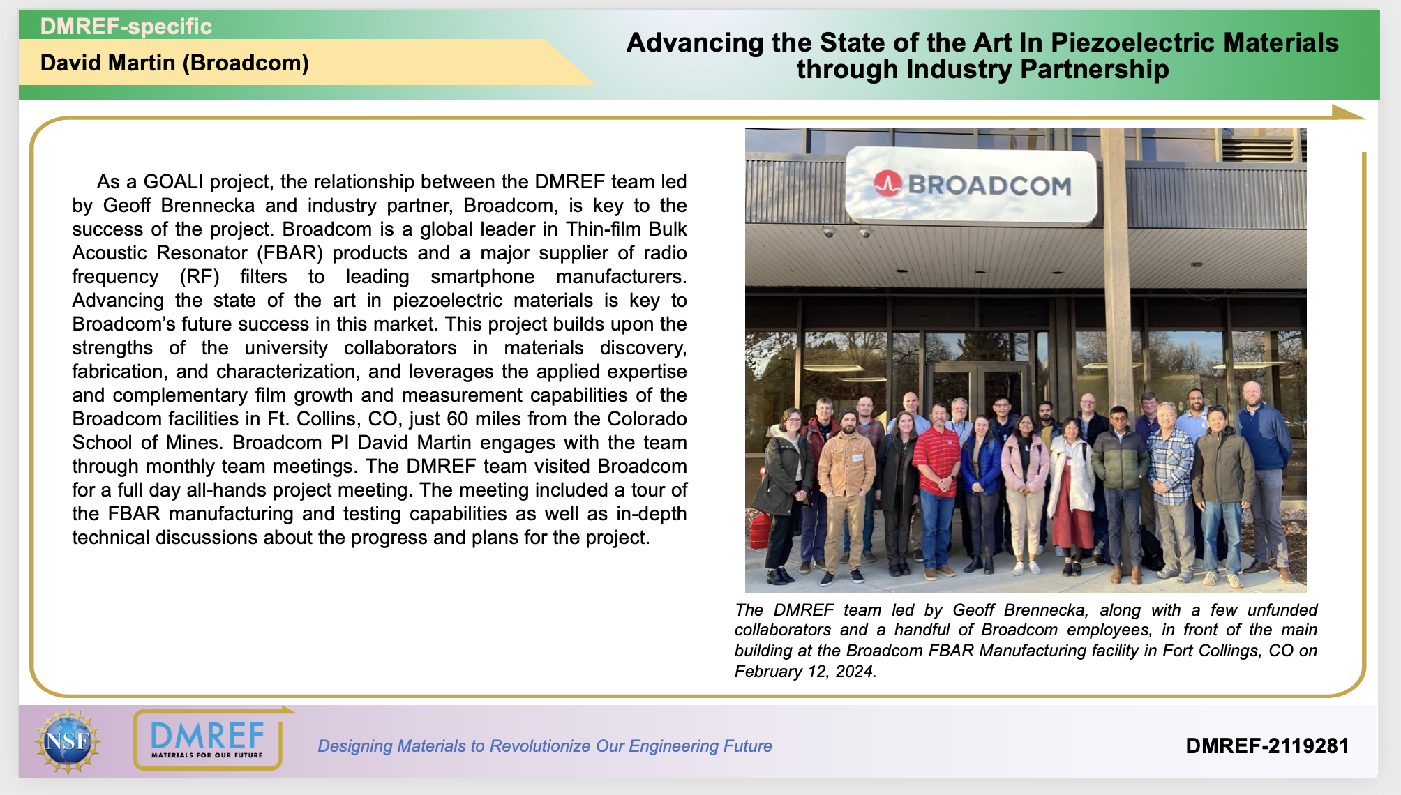 As a GOALI project, the relationship between the DMREF team led by Geoff Brennecka and industry partner, Broadcom, is key to the success of the project. Broadcom is a global leader in Thin-film Bulk Acoustic Resonator (FBAR) products and a major supplier of radio frequency (RF) filters to leading smartphone manufacturers. Advancing the state of the art in piezoelectric materials is key to Broadcom’s future success in this market. This project builds upon the strengths of the university collaborators in materials discovery, fabrication, and characterization, and leverages the applied expertise and complementary film growth and measurement capabilities of the Broadcom facilities in Ft. Collins, CO, just 60 miles from the Colorado School of Mines. Broadcom PI David Martin engages with the team through monthly team meetings. The DMREF team visited Broadcom for a full day all-hands project meeting. The meeting included a tour of the FBAR manufacturing and testing capabilities as well as in-depth technical discussions about the progress and plans for the project.