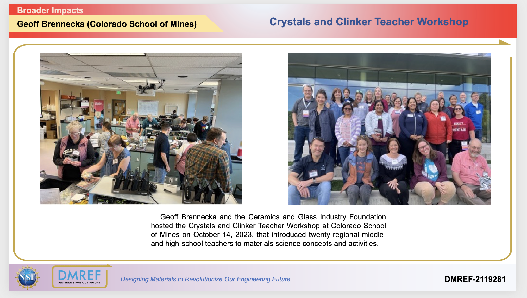 Geoff Brennecka and the Ceramics and Glass Industry Foundation hosted the Crystals and Clinker Teacher Workshop at Colorado School of Mines on October 14, 2023, that introduced twenty regional middle- and high-school teachers to materials science concepts and activities.