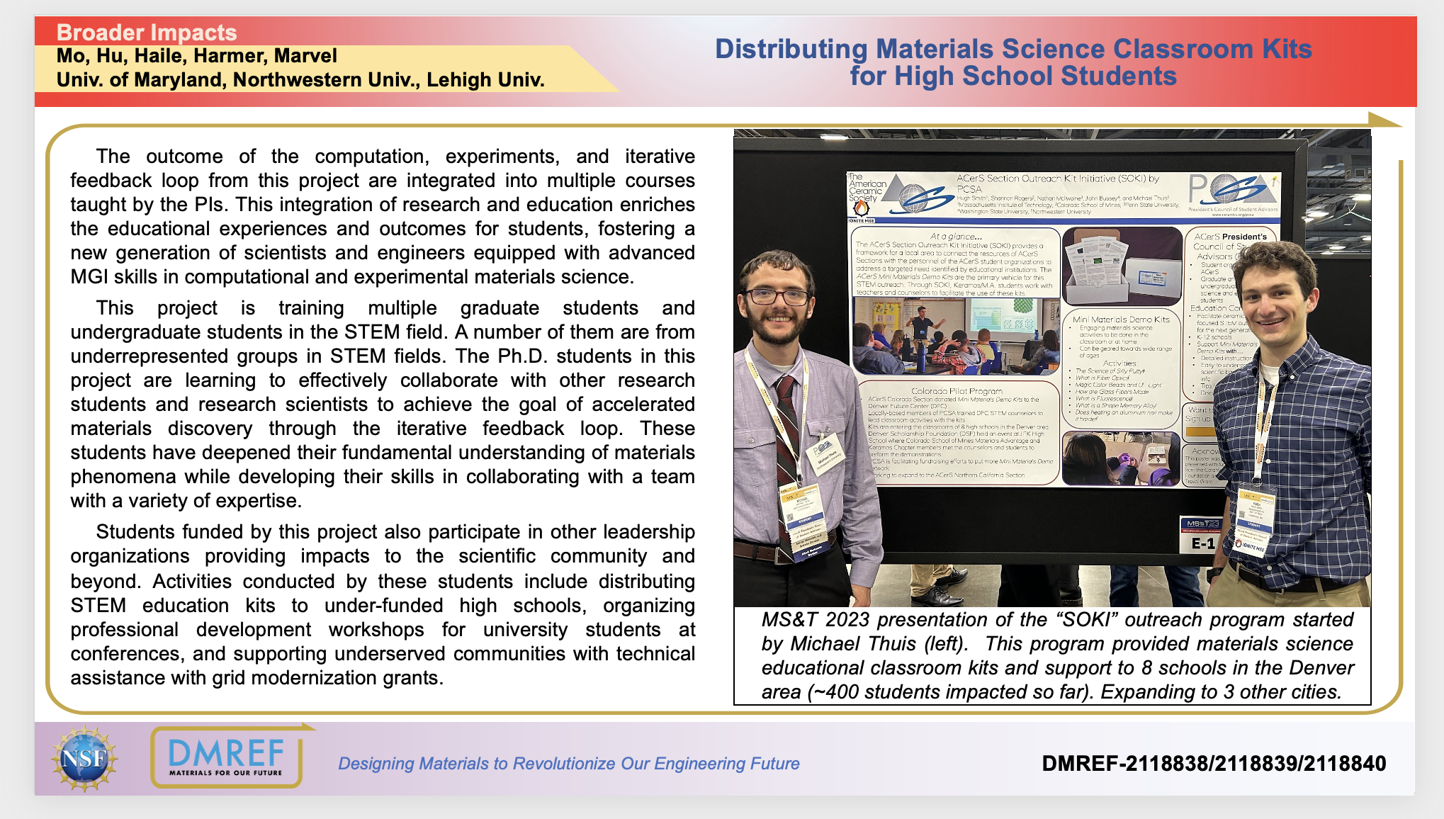 This project is training multiple graduate students and undergraduate students in the STEM field. A number of them are from underrepresented groups in STEM fields. The Ph.D. students in this project are learning to effectively collaborate with other research students and research scientists to achieve the goal of accelerated materials discovery through the iterative feedback loop. These students have deepened their fundamental understanding of materials phenomena while developing their skills in collaborating with a team with a variety of expertise.