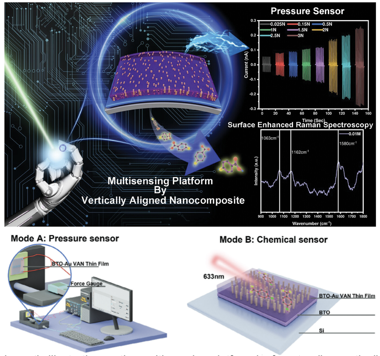 This paper reports a flexible, multifunctional sensor platform built from freestanding BaTiO3–Au vertically aligned nanocomposite (VAN) thin films. Using a water-soluble Sr3Al2O6 buffer, the VAN films were transferred onto PDMS, yielding devices. The Au nanopillars in BaTiO3 give coupled piezoelectric and plasmonic functions, with films remaining flexible and recoverable and maintaining stable piezoelectric output for pressure sensing. The platform also demonstrates surface-enhanced Raman sensing of 4-mercaptobenzoic acid, enabling integrated mechanical and chemical sensing for wearables.