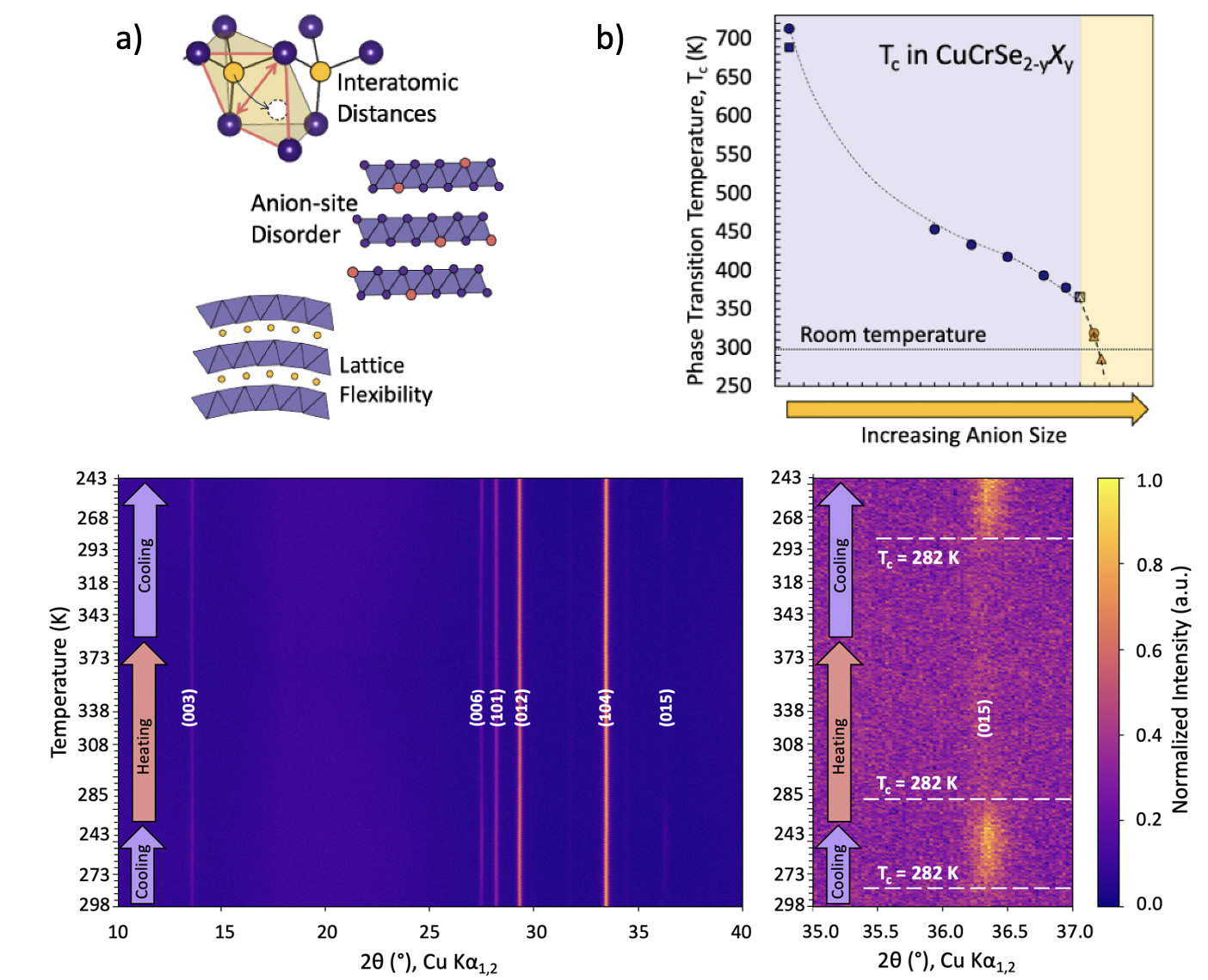 Paper: Controlling the Order–Disorder Transition Temperature through Anion Substitution in CuCrX2 (X= S, Se, Te). In CuCrSe2, substituting S or Te on the anion site shifts order–disorder transition, with Te reaching 282 K—the lowest for this structure. Structural and elastic data tie the trend to bond-length and lattice stiffness: larger anions expand distances and soften bonds, promoting cation disorder. This shows bonding-stiffness tuning by anion alloying can steer thermodynamics of order–disorder transitions in ionic conductors.