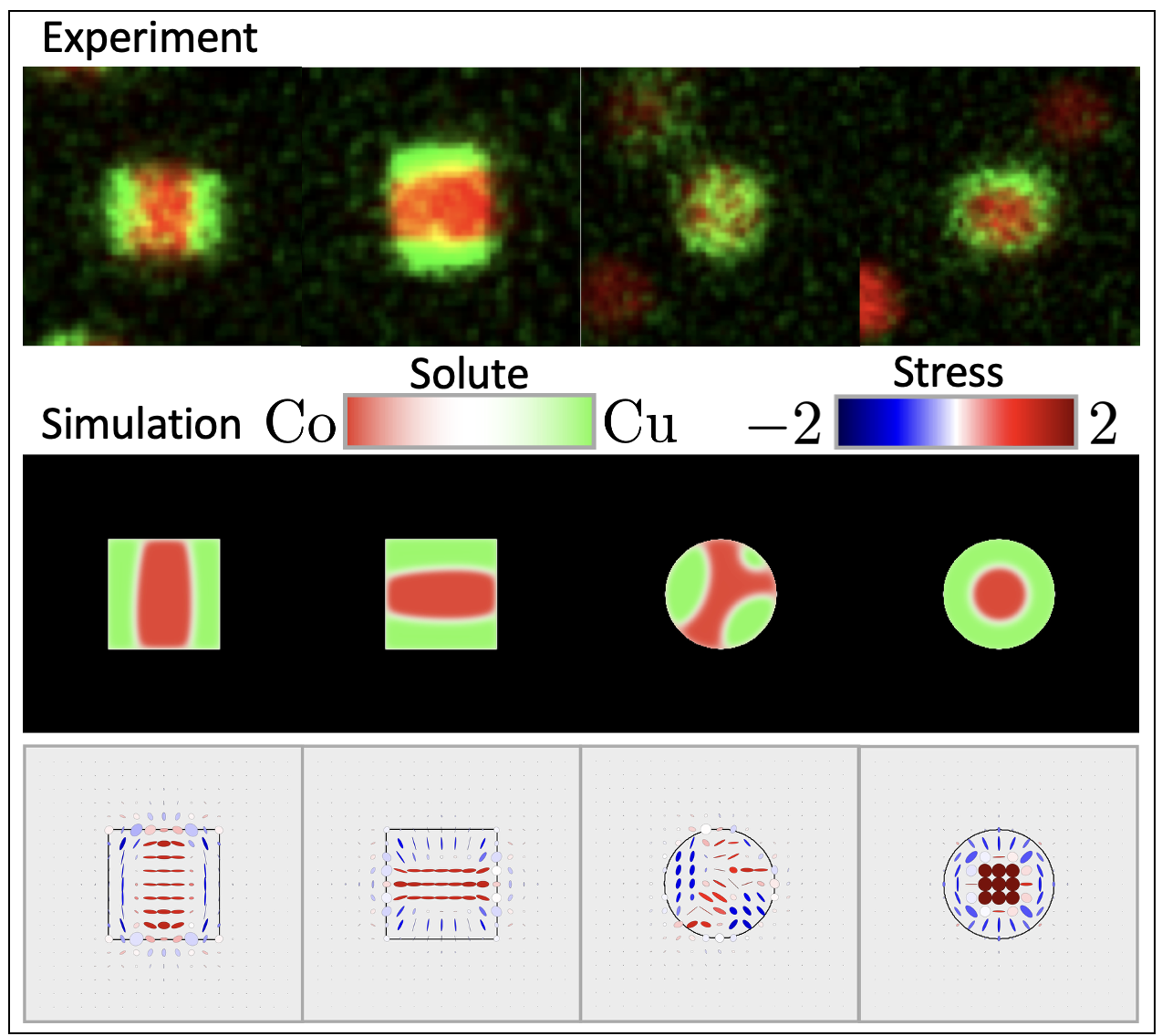This paper introduces a numerical framework to simulate how multicomponent metallic pillars form inside a BaTiO3 matrix used in hybrid metamaterials, by coupling diffusion with mechanical stress. It reproduces the observed Co-Cu pillar morphology and explains a copper outer shell as the result of competing mechanical and chemical energies. Shapes that lower internal stresses are favored: square pillars tend to candy-like forms, while circular ones move toward core–shell as more Cu is added.